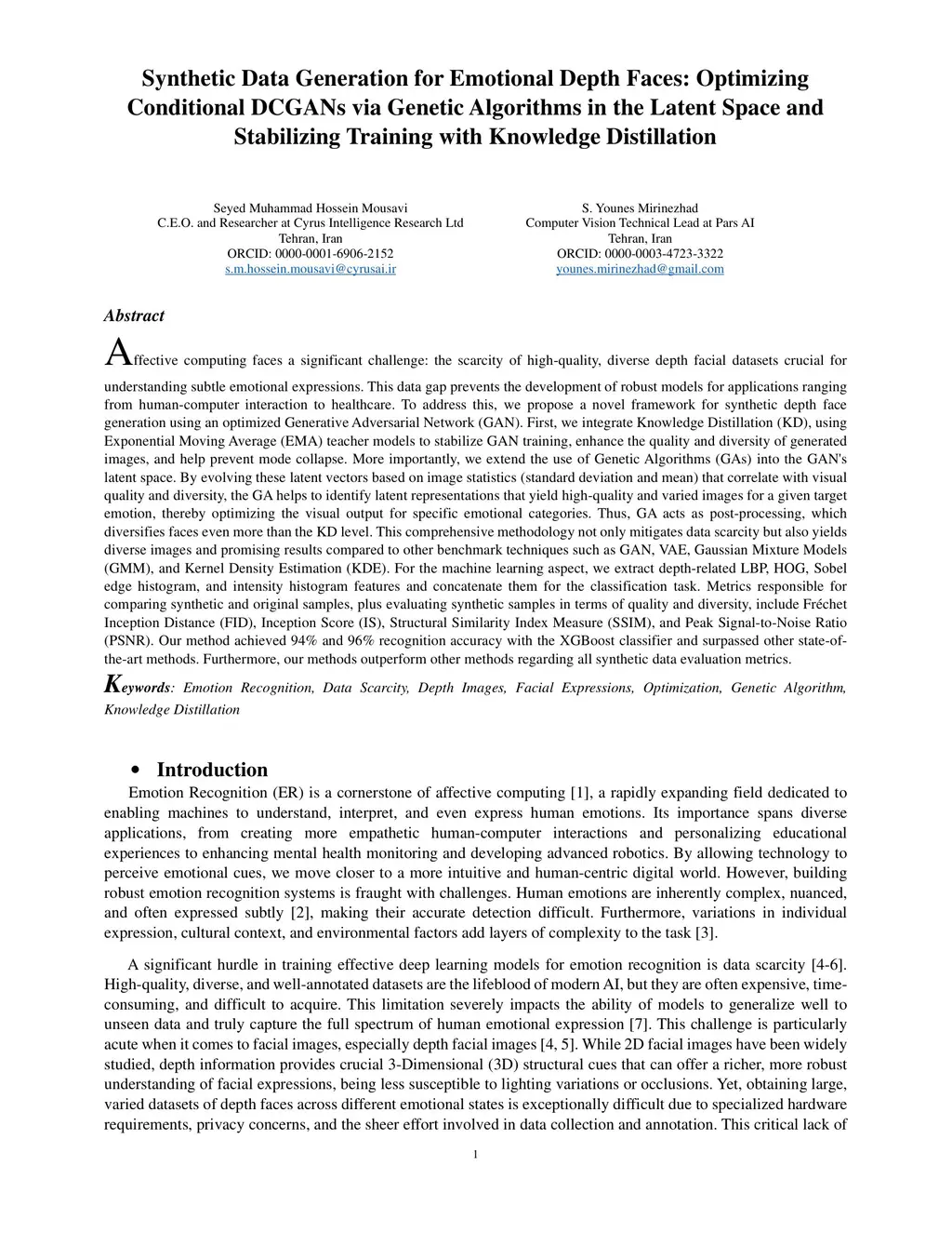 Affective computing faces a major challenge: the lack of high-quality, diverse depth facial datasets for recognizing subtle emotional expressions. We propose a framework for synthetic depth face generation using an optimized GAN with Knowledge Distillation (EMA teacher models) to stabilize training, improve quality, and prevent mode collapse. We also apply Genetic Algorithms to evolve GAN latent vectors based on image statistics, boosting diversity and visual quality for target emotions. The approach outperforms GAN, VAE, GMM, and KDE in both diversity and quality. For classification, we extract and concatenate LBP, HOG, Sobel edge, and intensity histogram features, achieving 94% and 96% accuracy with XGBoost. Evaluation using FID, IS, SSIM, and PSNR shows consistent improvement over state-of-the-art methods.