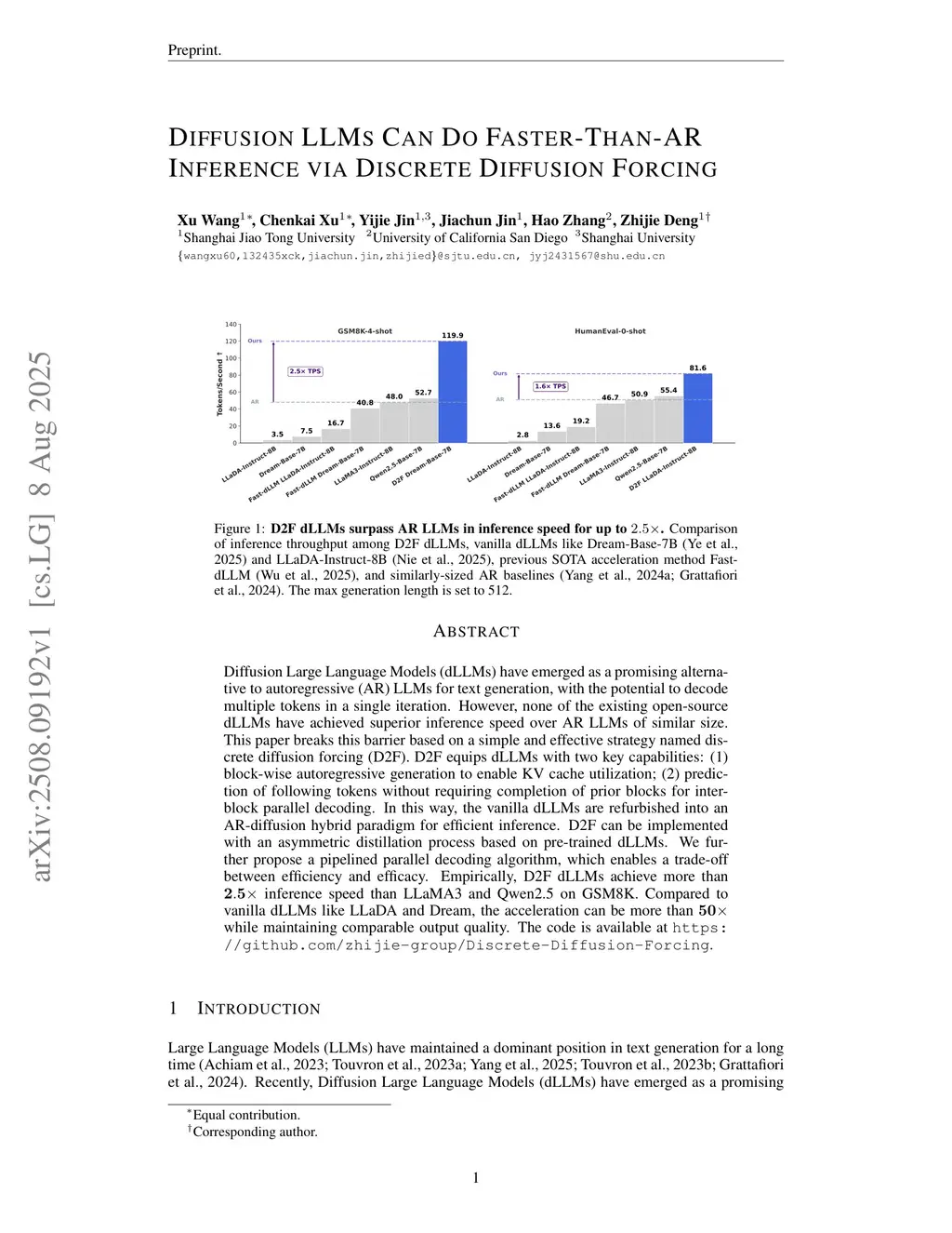 Diffusion Large Language Models (dLLMs) have emerged as a promising alternative to autoregressive (AR) LLMs for text generation, with the potential to decode multiple tokens in a single iteration. However, none of the existing open-source dLLMs have achieved superior inference speed over AR LLMs of similar size. This paper breaks this barrier based on a simple and effective strategy named discrete diffusion forcing (D2F). D2F equips dLLMs with two key capabilities: (1) block-wise autoregressive generation to enable KV cache utilization; (2) prediction of following tokens without requiring completion of prior blocks for inter-block parallel decoding. In this way, the vanilla dLLMs are refurbished into an AR-diffusion hybrid paradigm for efficient inference. D2F can be implemented with an asymmetric distillation process based on pre-trained dLLMs. We further propose a pipelined parallel decoding algorithm, which enables a trade-off between efficiency and efficacy. Empirically, D2F dLLMs achieve more than inference speed than LLaMA3 and Qwen2.5 on GSM8K. Compared to vanilla dLLMs like LLaDA and Dream, the acceleration can be more than while maintaining comparable output quality. The code is available atthis https URL.