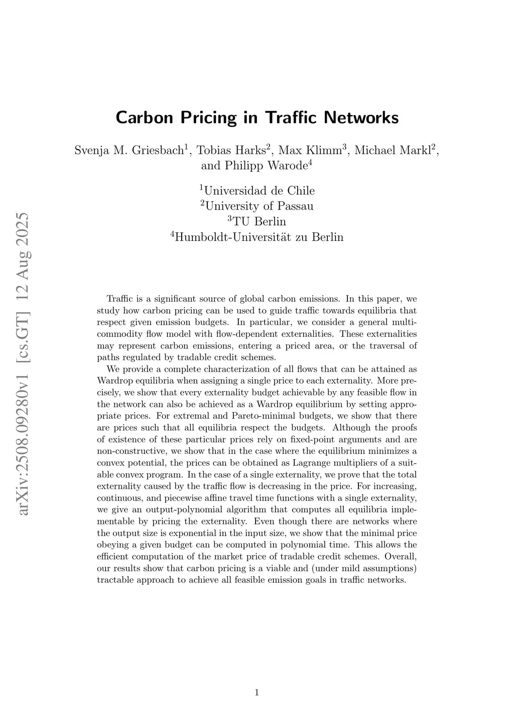 Traffic is a significant source of global carbon emissions. In this paper, we study how carbon pricing can be used to guide traffic towards equilibria that respect given emission budgets. In particular, we consider a general multi-commodity flow model with flow-dependent externalities. These externalities may represent carbon emissions, entering a priced area, or the traversal of paths regulated by tradable credit schemes.We provide a complete characterization of all flows that can be attained as Wardrop equilibria when assigning a single price to each externality. More precisely, we show that every externality budget achievable by any feasible flow in the network can also be achieved as a Wardrop equilibrium by setting appropriate prices. For extremal and Pareto-minimal budgets, we show that there are prices such that all equilibria respect the budgets. Although the proofs of existence of these particular prices rely on fixed-point arguments and are non-constructive, we show that in the case where the equilibrium minimizes a convex potential, the prices can be obtained as Lagrange multipliers of a suitable convex program. In the case of a single externality, we prove that the total externality caused by the traffic flow is decreasing in the price. For increasing, continuous, and piecewise affine travel time functions with a single externality, we give an output-polynomial algorithm that computes all equilibria implementable by pricing the externality. Even though there are networks where the output size is exponential in the input size, we show that the minimal price obeying a given budget can be computed in polynomial time. This allows the efficient computation of the market price of tradable credit schemes. Overall, our results show that carbon pricing is a viable and (under mild assumptions) tractable approach to achieve all feasible emission goals in traffic networks.