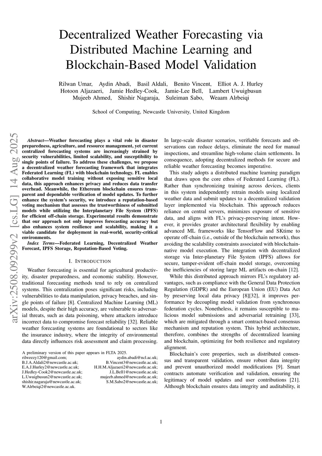 Decentralized Weather Forecasting via Distributed Machine Learning and Blockchain-Based Model Validation