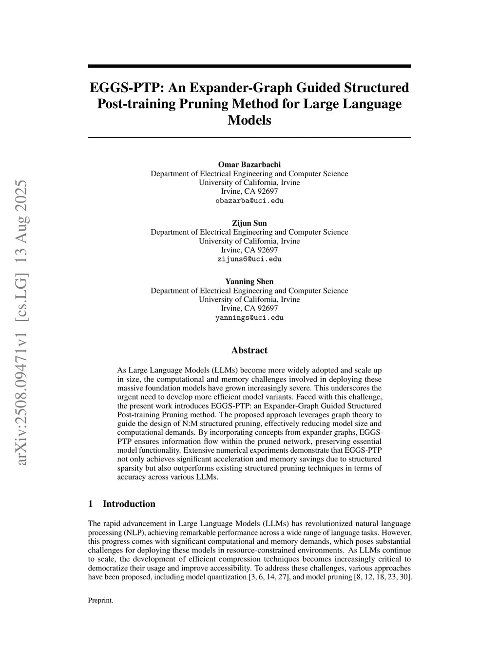 As Large Language Models (LLMs) become more widely adopted and scale up in size, the computational and memory challenges involved in deploying these massive foundation models have grown increasingly severe. This underscores the urgent need to develop more efficient model variants. Faced with this challenge, the present work introduces EGGS-PTP: an Expander-Graph Guided Structured Post-training Pruning method. The proposed approach leverages graph theory to guide the design of N:M structured pruning, effectively reducing model size and computational demands. By incorporating concepts from expander graphs, EGGS-PTP ensures information flow within the pruned network, preserving essential model functionality. Extensive numerical experiments demonstrate that EGGS-PTP not only achieves significant acceleration and memory savings due to structured sparsity but also outperforms existing structured pruning techniques in terms of accuracy across various LLMs.