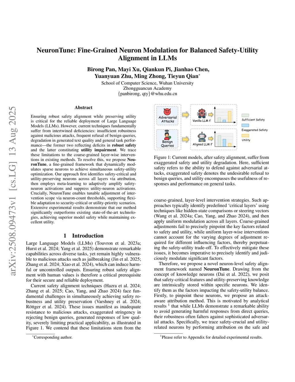 Ensuring robust safety alignment while preserving utility is critical for the reliable deployment of Large Language Models (LLMs). However, current techniques fundamentally suffer from intertwined deficiencies: insufficient robustness against malicious attacks, frequent refusal of benign queries, degradation in generated text quality and general task performance--the former two reflecting deficits in robust safety and the latter constituting utility impairment. We trace these limitations to the coarse-grained layer-wise interventions in existing methods. To resolve this, we propose NeuronTune, a fine-grained framework that dynamically modulates sparse neurons to achieve simultaneous safety-utility optimization. Our approach first identifies safety-critical and utility-preserving neurons across all layers via attribution, then employs meta-learning to adaptively amplify safety-neuron activations and suppress utility-neuron activations. Crucially, NeuronTune enables tunable adjustment of intervention scope via neuron-count thresholds, supporting flexible adaptation to security-critical or utility-priority scenarios. Extensive experimental results demonstrate that our method significantly outperforms existing state-of-the-art technologies, achieving superior model safety while maintaining excellent utility.