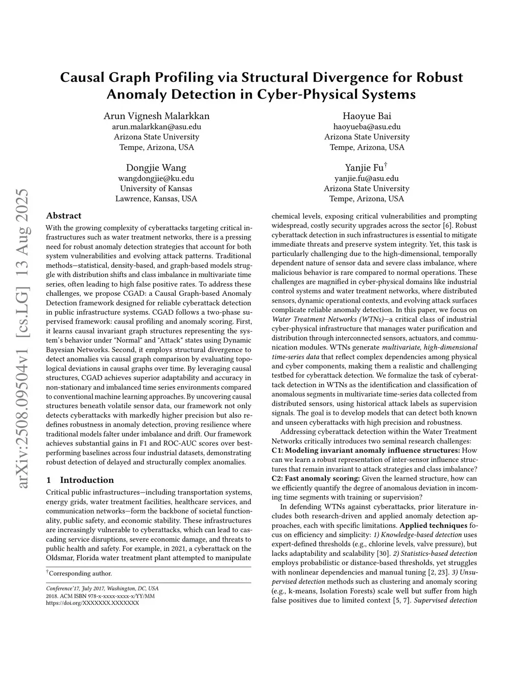 With the growing complexity of cyberattacks targeting critical infrastructures such as water treatment networks, there is a pressing need for robust anomaly detection strategies that account for both system vulnerabilities and evolving attack patterns. Traditional methods -- statistical, density-based, and graph-based models struggle with distribution shifts and class imbalance in multivariate time series, often leading to high false positive rates. To address these challenges, we propose CGAD, a Causal Graph-based Anomaly Detection framework designed for reliable cyberattack detection in public infrastructure systems. CGAD follows a two-phase supervised framework -- causal profiling and anomaly scoring. First, it learns causal invariant graph structures representing the system's behavior under "Normal" and "Attack" states using Dynamic Bayesian Networks. Second, it employs structural divergence to detect anomalies via causal graph comparison by evaluating topological deviations in causal graphs over time. By leveraging causal structures, CGAD achieves superior adaptability and accuracy in non-stationary and imbalanced time series environments compared to conventional machine learning approaches. By uncovering causal structures beneath volatile sensor data, our framework not only detects cyberattacks with markedly higher precision but also redefines robustness in anomaly detection, proving resilience where traditional models falter under imbalance and drift. Our framework achieves substantial gains in F1 and ROC-AUC scores over best-performing baselines across four industrial datasets, demonstrating robust detection of delayed and structurally complex anomalies.