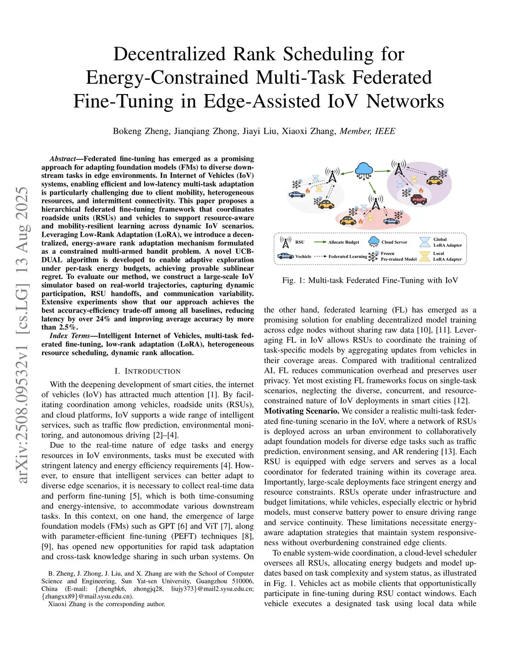 Federated fine-tuning has emerged as a promising approach for adapting foundation models (FMs) to diverse downstream tasks in edge environments. In Internet of Vehicles (IoV) systems, enabling efficient and low-latency multi-task adaptation is particularly challenging due to client mobility, heterogeneous resources, and intermittent connectivity. This paper proposes a hierarchical federated fine-tuning framework that coordinates roadside units (RSUs) and vehicles to support resource-aware and mobility-resilient learning across dynamic IoV scenarios. Leveraging Low-Rank Adaptation (LoRA), we introduce a decentralized, energy-aware rank adaptation mechanism formulated as a constrained multi-armed bandit problem. A novel UCB-DUAL algorithm is developed to enable adaptive exploration under per-task energy budgets, achieving provable sublinear regret. To evaluate our method, we construct a large-scale IoV simulator based on real-world trajectories, capturing dynamic participation, RSU handoffs, and communication variability. Extensive experiments show that our approach achieves the best accuracy-efficiency trade-off among all baselines, reducing latency by over 24\% and improving average accuracy by more than 2.5\%.