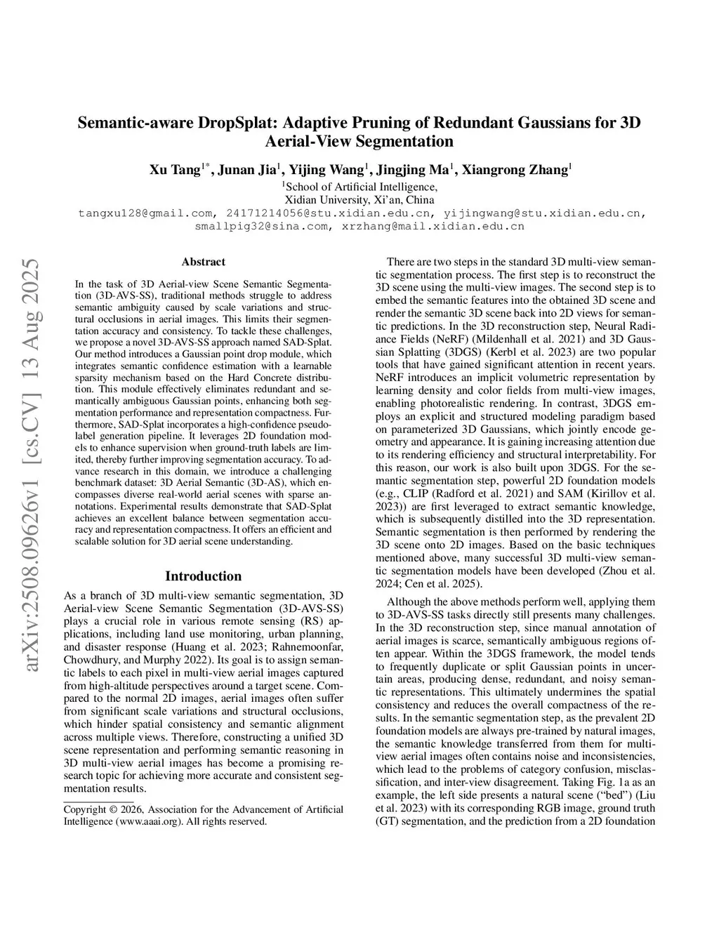 In the task of 3D Aerial-view Scene Semantic Segmentation (3D-AVS-SS), traditional methods struggle to address semantic ambiguity caused by scale variations and structural occlusions in aerial images. This limits their segmentation accuracy and consistency. To tackle these challenges, we propose a novel 3D-AVS-SS approach named SAD-Splat. Our method introduces a Gaussian point drop module, which integrates semantic confidence estimation with a learnable sparsity mechanism based on the Hard Concrete distribution. This module effectively eliminates redundant and semantically ambiguous Gaussian points, enhancing both segmentation performance and representation compactness. Furthermore, SAD-Splat incorporates a high-confidence pseudo-label generation pipeline. It leverages 2D foundation models to enhance supervision when ground-truth labels are limited, thereby further improving segmentation accuracy. To advance research in this domain, we introduce a challenging benchmark dataset: 3D Aerial Semantic (3D-AS), which encompasses diverse real-world aerial scenes with sparse annotations. Experimental results demonstrate that SAD-Splat achieves an excellent balance between segmentation accuracy and representation compactness. It offers an efficient and scalable solution for 3D aerial scene understanding.