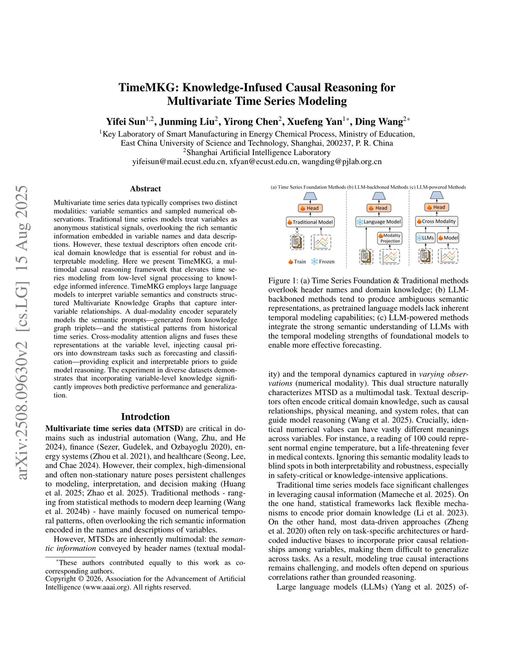 Multivariate time series data typically comprises two distinct modalities: variable semantics and sampled numerical observations. Traditional time series models treat variables as anonymous statistical signals, overlooking the rich semantic information embedded in variable names and data descriptions. However, these textual descriptors often encode critical domain knowledge that is essential for robust and interpretable modeling. Here we present TimeMKG, a multimodal causal reasoning framework that elevates time series modeling from low-level signal processing to knowledge informed inference. TimeMKG employs large language models to interpret variable semantics and constructs structured Multivariate Knowledge Graphs that capture inter-variable relationships. A dual-modality encoder separately models the semantic prompts, generated from knowledge graph triplets, and the statistical patterns from historical time series. Cross-modality attention aligns and fuses these representations at the variable level, injecting causal priors into downstream tasks such as forecasting and classification, providing explicit and interpretable priors to guide model reasoning. The experiment in diverse datasets demonstrates that incorporating variable-level knowledge significantly improves both predictive performance and generalization.