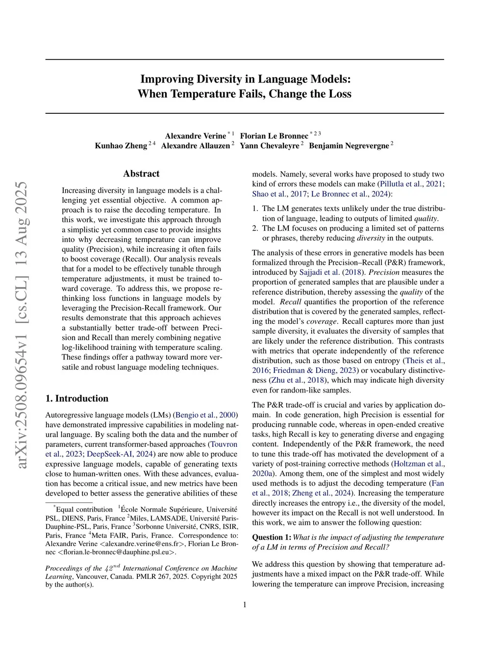 Increasing diversity in language models is a challenging yet essential objective. A common approach is to raise the decoding temperature. In this work, we investigate this approach through a simplistic yet common case to provide insights into why decreasing temperature can improve quality (Precision), while increasing it often fails to boost coverage (Recall). Our analysis reveals that for a model to be effectively tunable through temperature adjustments, it must be trained toward coverage. To address this, we propose rethinking loss functions in language models by leveraging the Precision-Recall framework. Our results demonstrate that this approach achieves a substantially better trade-off between Precision and Recall than merely combining negative log-likelihood training with temperature scaling. These findings offer a pathway toward more versatile and robust language modeling techniques.