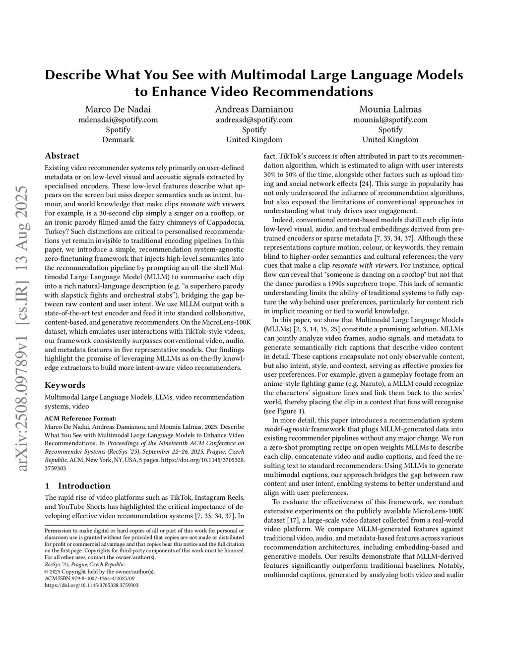 Existing video recommender systems rely primarily on user-defined metadata or on low-level visual and acoustic signals extracted by specialised encoders. These low-level features describe what appears on the screen but miss deeper semantics such as intent, humour, and world knowledge that make clips resonate with viewers. For example, is a 30-second clip simply a singer on a rooftop, or an ironic parody filmed amid the fairy chimneys of Cappadocia, Turkey? Such distinctions are critical to personalised recommendations yet remain invisible to traditional encoding pipelines. In this paper, we introduce a simple, recommendation system-agnostic zero-finetuning framework that injects high-level semantics into the recommendation pipeline by prompting an off-the-shelf Multimodal Large Language Model (MLLM) to summarise each clip into a rich natural-language description (e.g. "a superhero parody with slapstick fights and orchestral stabs"), bridging the gap between raw content and user intent. We use MLLM output with a state-of-the-art text encoder and feed it into standard collaborative, content-based, and generative recommenders. On the MicroLens-100K dataset, which emulates user interactions with TikTok-style videos, our framework consistently surpasses conventional video, audio, and metadata features in five representative models. Our findings highlight the promise of leveraging MLLMs as on-the-fly knowledge extractors to build more intent-aware video recommenders.