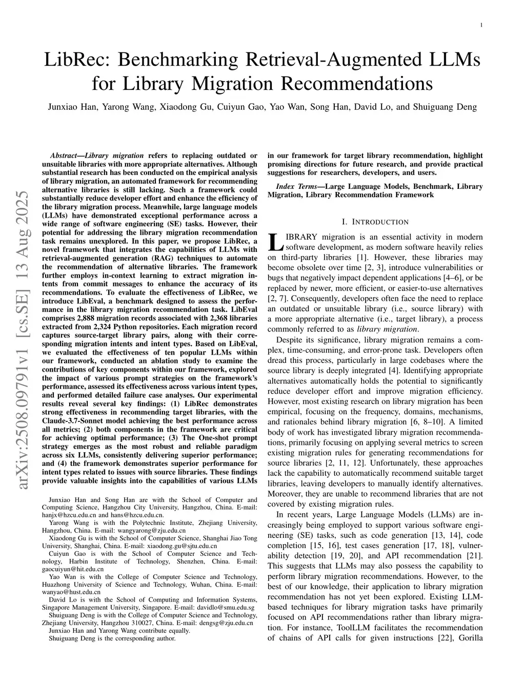 In this paper, we propose LibRec, a novel framework that integrates the capabilities of LLMs with retrieval-augmented generation(RAG) techniques to automate the recommendation of alternative libraries. The framework further employs in-context learning to extract migration intents from commit messages to enhance the accuracy of its recommendations. To evaluate the effectiveness of LibRec, we introduce LibEval, a benchmark designed to assess the performance in the library migration recommendation task. LibEval comprises 2,888 migration records associated with 2,368 libraries extracted from 2,324 Python repositories. Each migration record captures source-target library pairs, along with their corresponding migration intents and intent types. Based on LibEval, we evaluated the effectiveness of ten popular LLMs within our framework, conducted an ablation study to examine the contributions of key components within our framework, explored the impact of various prompt strategies on the framework's performance, assessed its effectiveness across various intent types, and performed detailed failure case analyses.