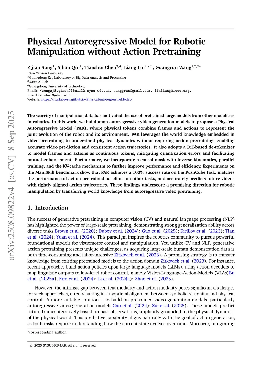 The scarcity of manipulation data has motivated the use of pretrained large models from other modalities in robotics. In this work, we build upon autoregressive video generation models to propose a Physical Autoregressive Model (PAR), where physical tokens combine frames and actions to represent the joint evolution of the robot and its environment. PAR leverages the world knowledge embedded in video pretraining to understand physical dynamics without requiring action pretraining, enabling accurate video prediction and consistent action trajectories. It also adopts a DiT-based de-tokenizer to model frames and actions as continuous tokens, mitigating quantization errors and facilitating mutual enhancement. Furthermore, we incorporate a causal mask with inverse kinematics, parallel training, and the KV-cache mechanism to further improve performance and efficiency. Experiments on the ManiSkill benchmark show that PAR achieves a 100\% success rate on the PushCube task, matches the performance of action-pretrained baselines on other tasks, and accurately predicts future videos with tightly aligned action trajectories. These findings underscore a promising direction for robotic manipulation by transferring world knowledge from autoregressive video pretraining. The project page is here:this https URL
