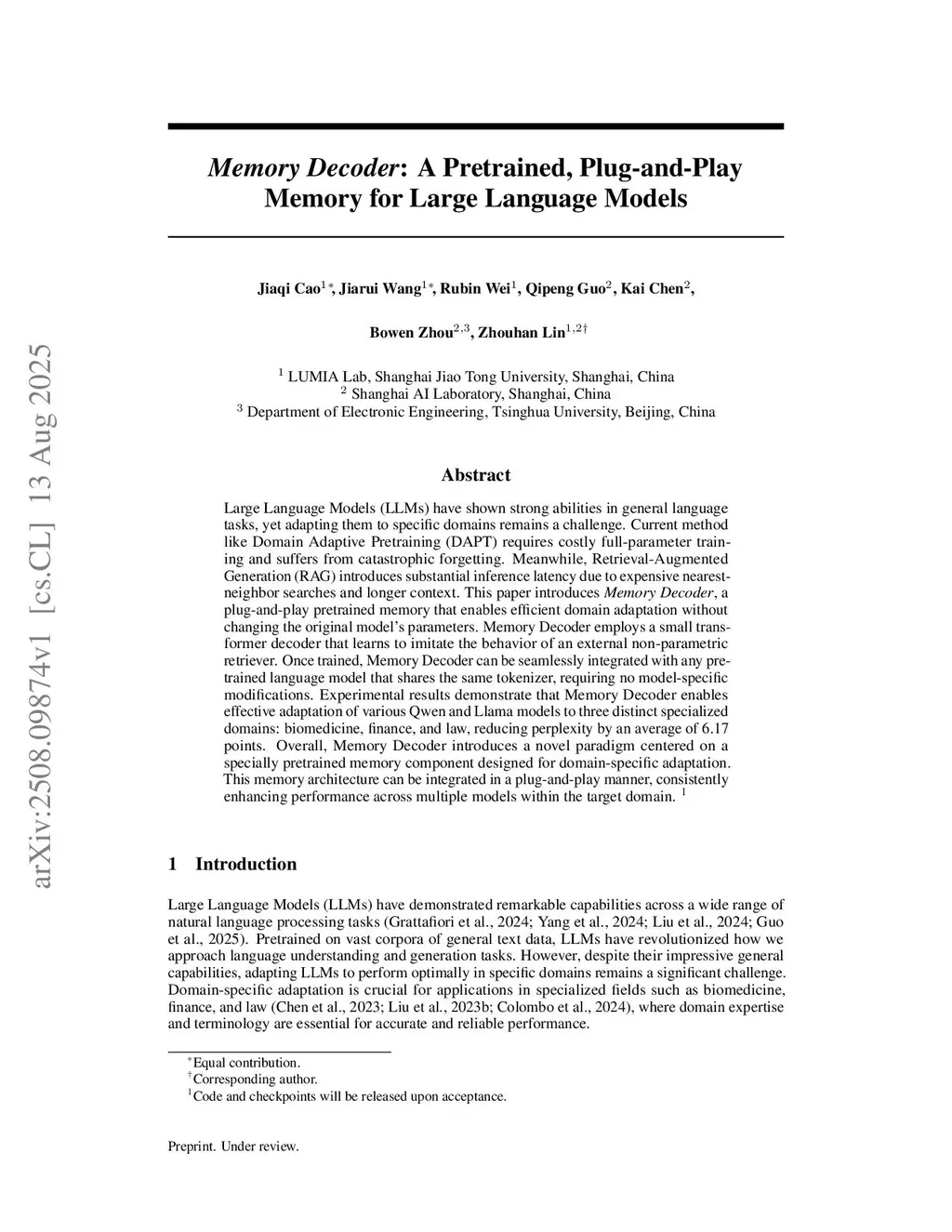 Memory Decoder: A Pretrained, Plug-and-Play Memory for Large Language Models