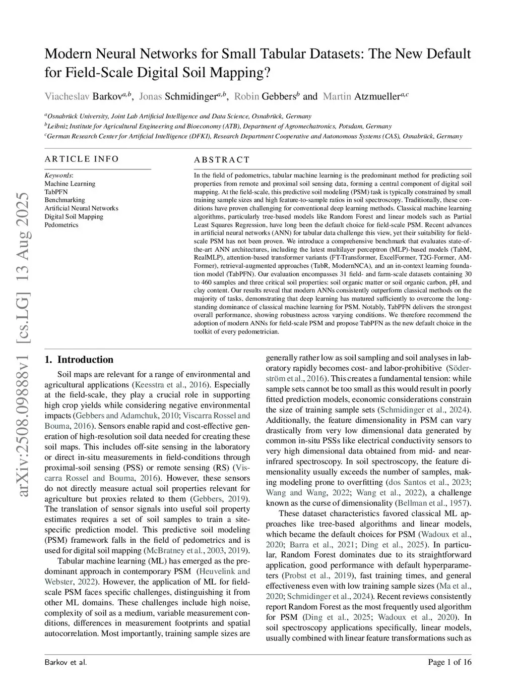 In the field of pedometrics, tabular machine learning is the predominant method for predicting soil properties from remote and proximal soil sensing data, forming a central component of digital soil mapping. At the field-scale, this predictive soil modeling (PSM) task is typically constrained by small training sample sizes and high feature-to-sample ratios in soil spectroscopy. Traditionally, these conditions have proven challenging for conventional deep learning methods. Classical machine learning algorithms, particularly tree-based models like Random Forest and linear models such as Partial Least Squares Regression, have long been the default choice for field-scale PSM. Recent advances in artificial neural networks (ANN) for tabular data challenge this view, yet their suitability for field-scale PSM has not been proven. We introduce a comprehensive benchmark that evaluates state-of-the-art ANN architectures, including the latest multilayer perceptron (MLP)-based models (TabM, RealMLP), attention-based transformer variants (FT-Transformer, ExcelFormer, T2G-Former, AMFormer), retrieval-augmented approaches (TabR, ModernNCA), and an in-context learning foundation model (TabPFN). Our evaluation encompasses 31 field- and farm-scale datasets containing 30 to 460 samples and three critical soil properties: soil organic matter or soil organic carbon, pH, and clay content. Our results reveal that modern ANNs consistently outperform classical methods on the majority of tasks, demonstrating that deep learning has matured sufficiently to overcome the long-standing dominance of classical machine learning for PSM. Notably, TabPFN delivers the strongest overall performance, showing robustness across varying conditions. We therefore recommend the adoption of modern ANNs for field-scale PSM and propose TabPFN as the new default choice in the toolkit of every pedometrician.