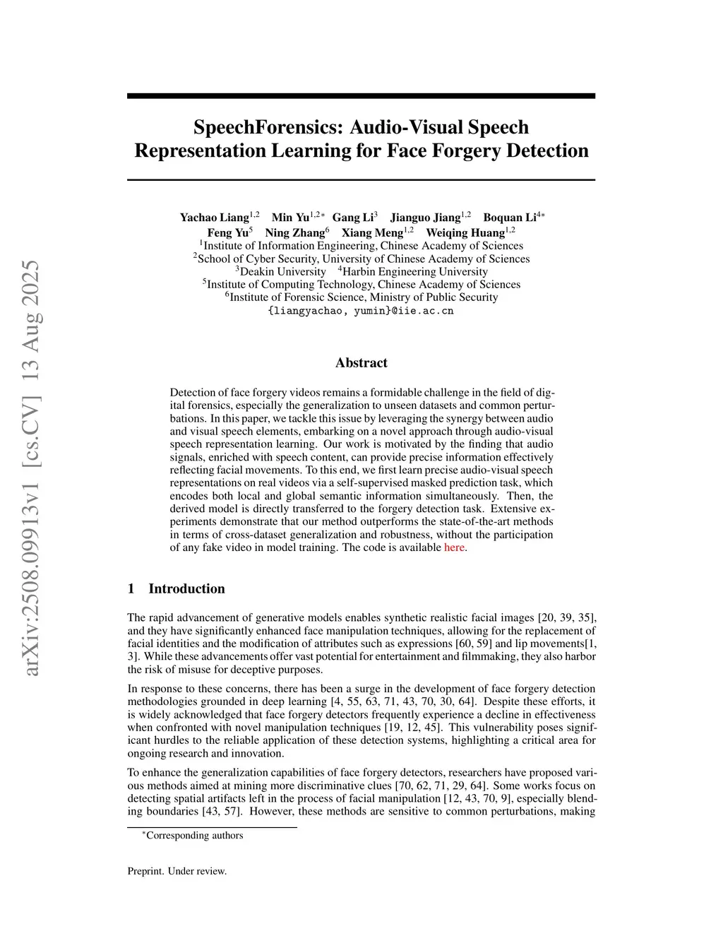 SpeechForensics: Audio-Visual Speech Representation Learning for Face Forgery Detection