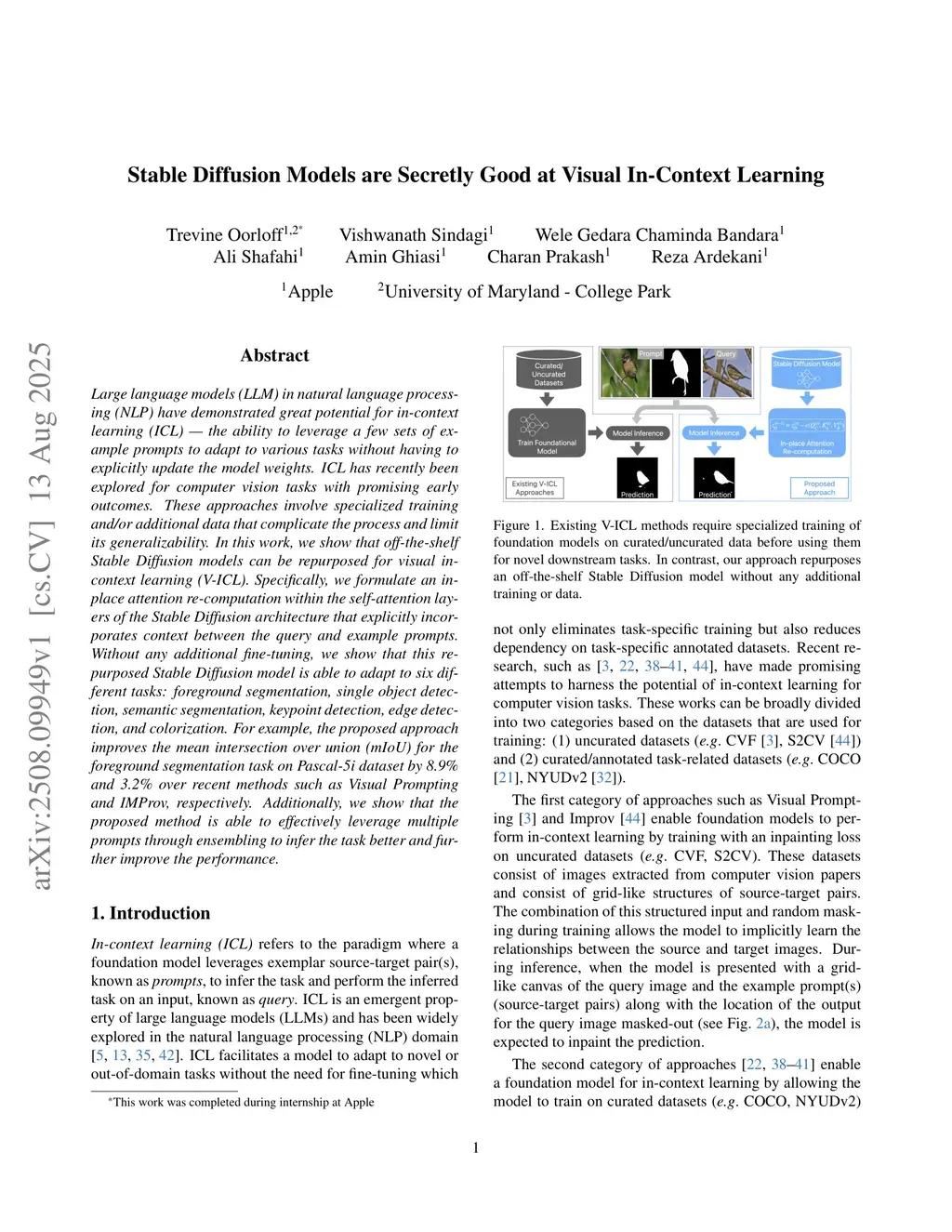 Large language models (LLM) in natural language processing (NLP) have demonstrated great potential for in-context learning (ICL) -- the ability to leverage a few sets of example prompts to adapt to various tasks without having to explicitly update the model weights. ICL has recently been explored for computer vision tasks with promising early outcomes. These approaches involve specialized training and/or additional data that complicate the process and limit its generalizability. In this work, we show that off-the-shelf Stable Diffusion models can be repurposed for visual in-context learning (V-ICL). Specifically, we formulate an in-place attention re-computation within the self-attention layers of the Stable Diffusion architecture that explicitly incorporates context between the query and example prompts. Without any additional fine-tuning, we show that this repurposed Stable Diffusion model is able to adapt to six different tasks: foreground segmentation, single object detection, semantic segmentation, keypoint detection, edge detection, and colorization. For example, the proposed approach improves the mean intersection over union (mIoU) for the foreground segmentation task on Pascal-5i dataset by 8.9% and 3.2% over recent methods such as Visual Prompting and IMProv, respectively. Additionally, we show that the proposed method is able to effectively leverage multiple prompts through ensembling to infer the task better and further improve the performance.
