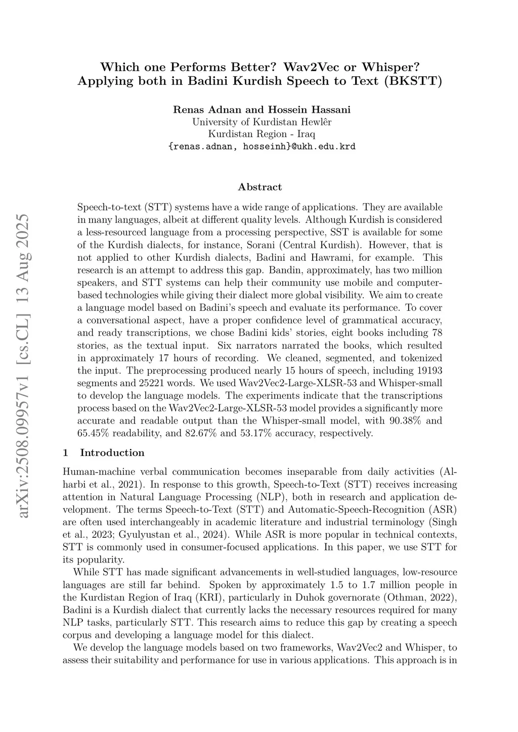Which one Performs Better? Wav2Vec or Whisper? Applying both in Badini Kurdish Speech to Text (BKSTT)