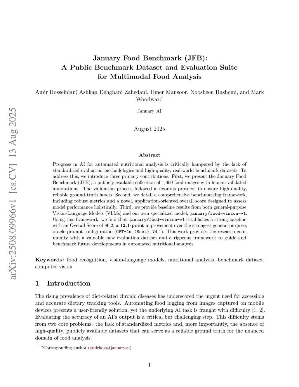 Progress in AI for automated nutritional analysis is critically hampered by the lack of standardized evaluation methodologies and high-quality, real-world benchmark datasets. To address this, we introduce three primary contributions. First, we present the January Food Benchmark (JFB), a publicly available collection of 1,000 food images with human-validated annotations. Second, we detail a comprehensive benchmarking framework, including robust metrics and a novel, application-oriented overall score designed to assess model performance holistically. Third, we provide baseline results from both general-purpose Vision-Language Models (VLMs) and our own specialized model, january/food-vision-v1. Our evaluation demonstrates that the specialized model achieves an Overall Score of 86.2, a 12.1-point improvement over the best-performing general-purpose configuration. This work offers the research community a valuable new evaluation dataset and a rigorous framework to guide and benchmark future developments in automated nutritional analysis.