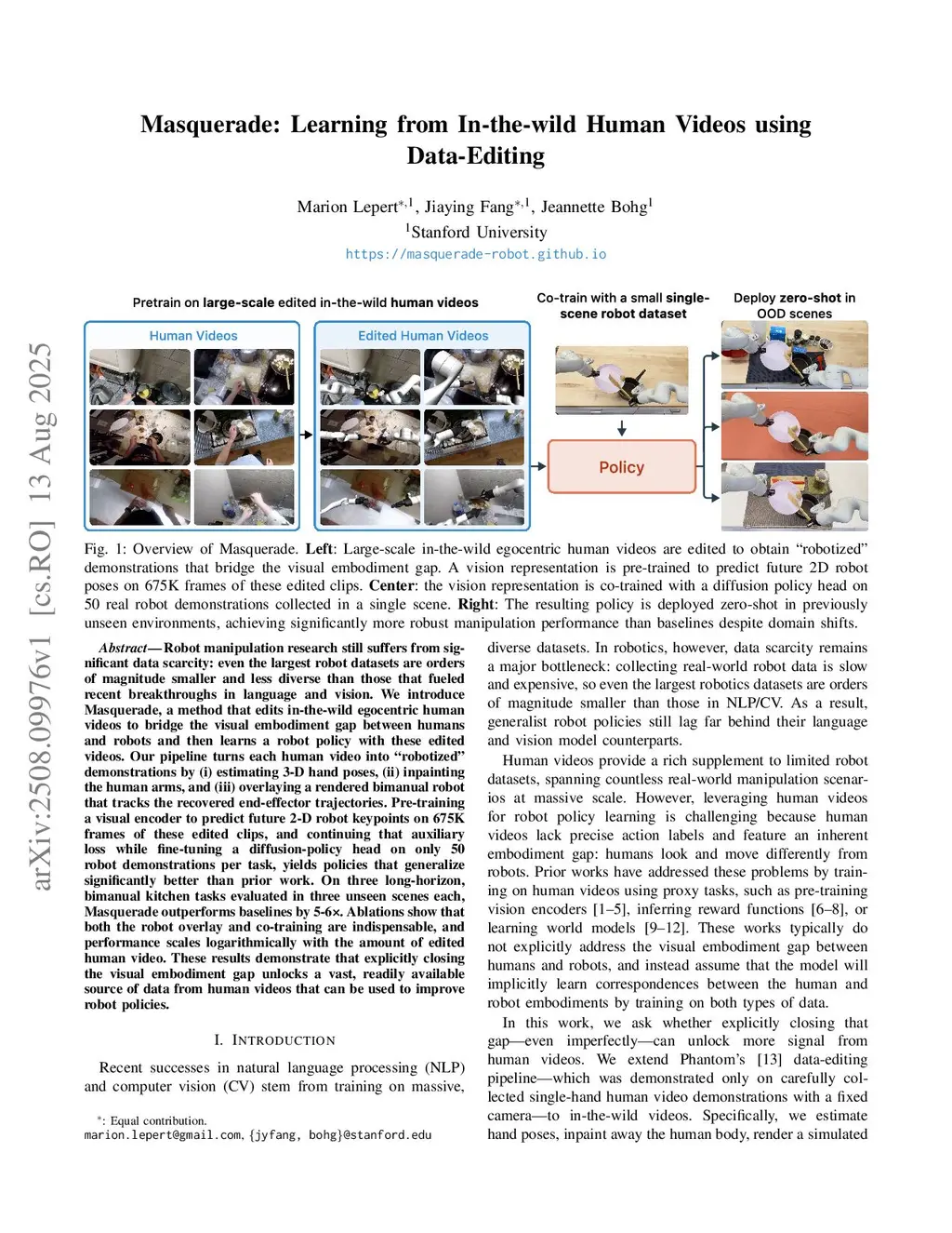 Robot manipulation research still suffers from significant data scarcity: even the largest robot datasets are orders of magnitude smaller and less diverse than those that fueled recent breakthroughs in language and vision. We introduce Masquerade, a method that edits in-the-wild egocentric human videos to bridge the visual embodiment gap between humans and robots and then learns a robot policy with these edited videos. Our pipeline turns each human video into robotized demonstrations by (i) estimating 3-D hand poses, (ii) inpainting the human arms, and (iii) overlaying a rendered bimanual robot that tracks the recovered end-effector trajectories. Pre-training a visual encoder to predict future 2-D robot keypoints on 675K frames of these edited clips, and continuing that auxiliary loss while fine-tuning a diffusion policy head on only 50 robot demonstrations per task, yields policies that generalize significantly better than prior work. On three long-horizon, bimanual kitchen tasks evaluated in three unseen scenes each, Masquerade outperforms baselines by 5-6x. Ablations show that both the robot overlay and co-training are indispensable, and performance scales logarithmically with the amount of edited human video. These results demonstrate that explicitly closing the visual embodiment gap unlocks a vast, readily available source of data from human videos that can be used to improve robot policies.