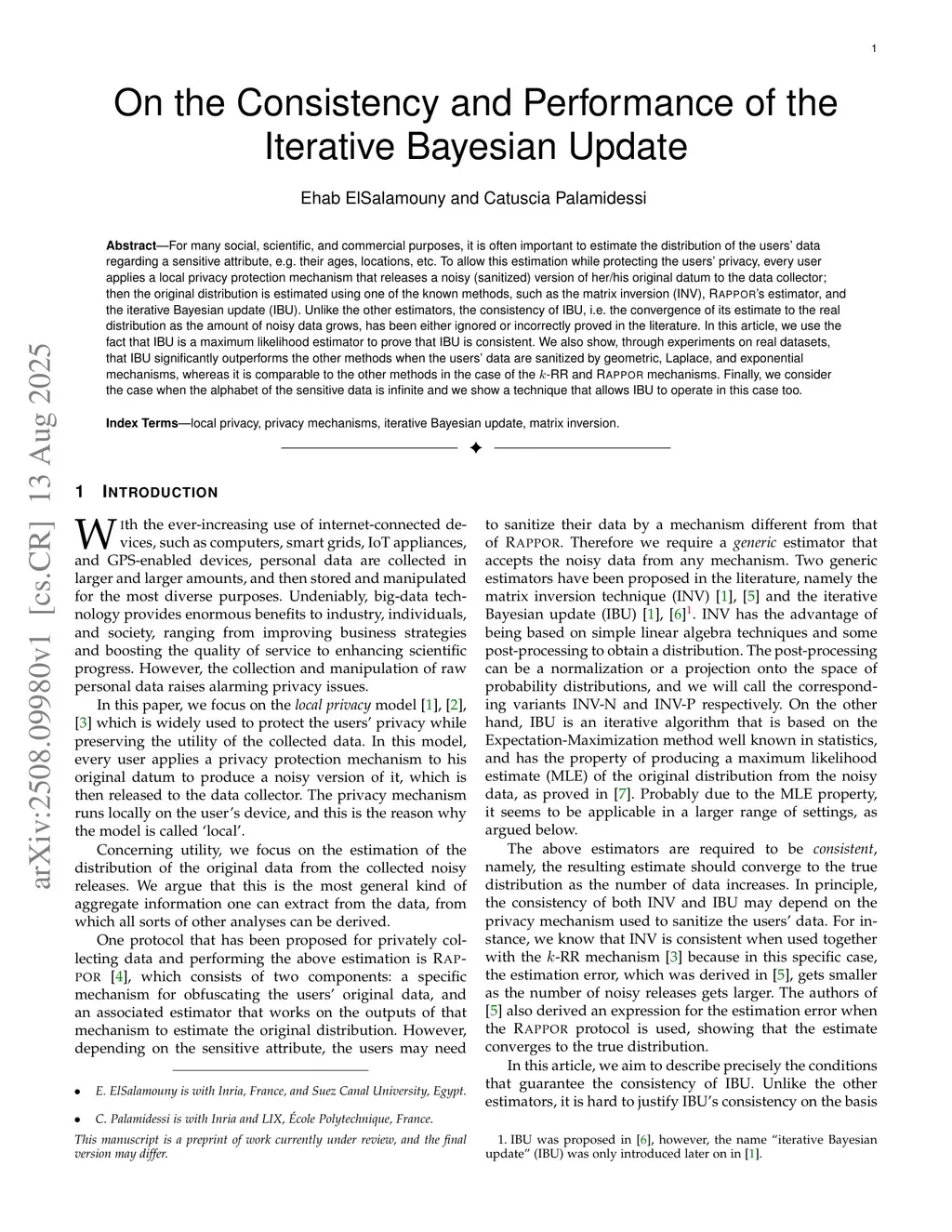 For many social, scientific, and commercial purposes, it is often important to estimate the distribution of the users' data regarding a sensitive attribute, e.g., their ages, locations, etc. To allow this estimation while protecting the users' privacy, every user applies a local privacy protection mechanism that releases a noisy (sanitized) version of their original datum to the data collector; then the original distribution is estimated using one of the known methods, such as the matrix inversion (INV), RAPPOR's estimator, and the iterative Bayesian update (IBU). Unlike the other estimators, the consistency of IBU, i.e., the convergence of its estimate to the real distribution as the amount of noisy data grows, has been either ignored or incorrectly proved in the literature. In this article, we use the fact that IBU is a maximum likelihood estimator to prove that IBU is consistent. We also show, through experiments on real datasets, that IBU significantly outperforms the other methods when the users' data are sanitized by geometric, Laplace, and exponential mechanisms, whereas it is comparable to the other methods in the case of the k-RR and RAPPOR mechanisms. Finally, we consider the case when the alphabet of the sensitive data is infinite, and we show a technique that allows IBU to operate in this case too.