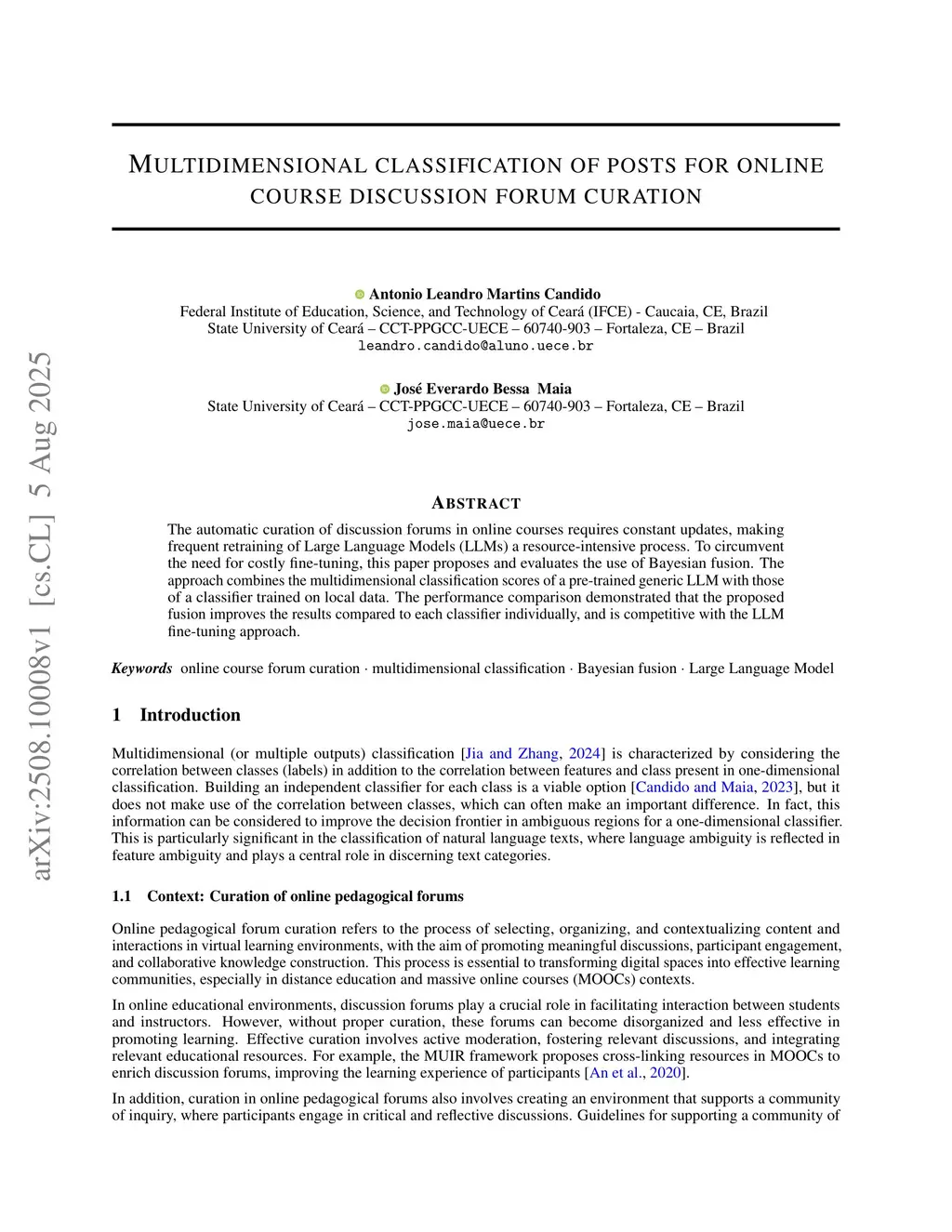 The automatic curation of discussion forums in online courses requires constant updates, making frequent retraining of Large Language Models (LLMs) a resource-intensive process. To circumvent the need for costly fine-tuning, this paper proposes and evaluates the use of Bayesian fusion. The approach combines the multidimensional classification scores of a pre-trained generic LLM with those of a classifier trained on local data. The performance comparison demonstrated that the proposed fusion improves the results compared to each classifier individually, and is competitive with the LLM fine-tuning approach