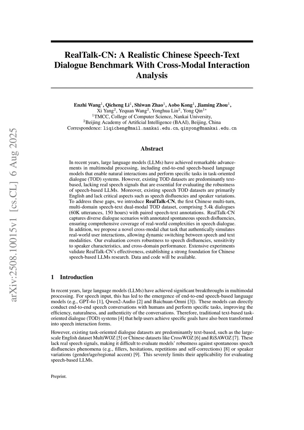 In recent years, large language models (LLMs) have achieved remarkable advancements in multimodal processing, including end-to-end speech-based language models that enable natural interactions and perform specific tasks in task-oriented dialogue (TOD) systems. However, existing TOD datasets are predominantly text-based, lacking real speech signals that are essential for evaluating the robustness of speech-based LLMs. Moreover, existing speech TOD datasets are primarily English and lack critical aspects such as speech disfluencies and speaker variations. To address these gaps, we introduce RealTalk-CN, the first Chinese multi-turn, multi-domain speech-text dual-modal TOD dataset, comprising 5.4k dialogues (60K utterances, 150 hours) with paired speech-text annotations. RealTalk-CN captures diverse dialogue scenarios with annotated spontaneous speech disfluencies, ensuring comprehensive coverage of real-world complexities in speech dialogue. In addition, we propose a novel cross-modal chat task that authentically simulates real-world user interactions, allowing dynamic switching between speech and text modalities. Our evaluation covers robustness to speech disfluencies, sensitivity to speaker characteristics, and cross-domain performance. Extensive experiments validate the effectiveness of RealTalk-CN, establishing a strong foundation for Chinese speech-based LLMs research.