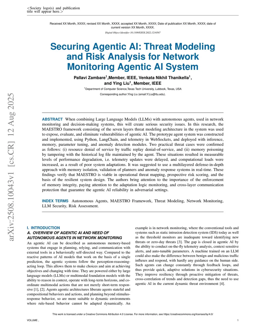 When combining Large Language Models (LLMs) with autonomous agents, used in network monitoring and decision-making systems, this will create serious security issues. In this research, the MAESTRO framework consisting of the seven layers threat modeling architecture in the system was used to expose, evaluate, and eliminate vulnerabilities of agentic AI. The prototype agent system was constructed and implemented, using Python, LangChain, and telemetry in WebSockets, and deployed with inference, memory, parameter tuning, and anomaly detection modules. Two practical threat cases were confirmed as follows: (i) resource denial of service by traffic replay denial-of-service, and (ii) memory poisoning by tampering with the historical log file maintained by the agent. These situations resulted in measurable levels of performance degradation, i.e. telemetry updates were delayed, and computational loads were increased, as a result of poor system adaptations. It was suggested to use a multilayered defense-in-depth approach with memory isolation, validation of planners and anomaly response systems in real-time. These findings verify that MAESTRO is viable in operational threat mapping, prospective risk scoring, and the basis of the resilient system design. The authors bring attention to the importance of the enforcement of memory integrity, paying attention to the adaptation logic monitoring, and cross-layer communication protection that guarantee the agentic AI reliability in adversarial settings.