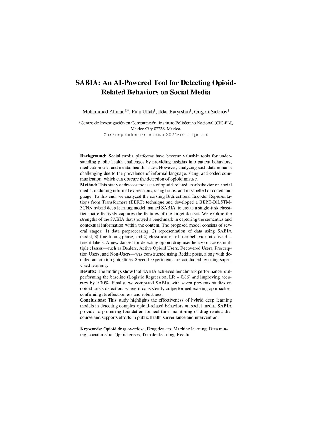 Social media platforms have become valuable tools for understanding public health challenges by offering insights into patient behaviors, medication use, and mental health issues. However, analyzing such data remains difficult due to the prevalence of informal language, slang, and coded communication, which can obscure the detection of opioid misuse. This study addresses the issue of opioid-related user behavior on social media, including informal expressions, slang terms, and misspelled or coded language. We analyzed the existing Bidirectional Encoder Representations from Transformers (BERT) technique and developed a BERT-BiLSTM-3CNN hybrid deep learning model, named SABIA, to create a single-task classifier that effectively captures the features of the target dataset. The SABIA model demonstrated strong capabilities in capturing semantics and contextual information. The proposed approach includes: (1) data preprocessing, (2) data representation using the SABIA model, (3) a fine-tuning phase, and (4) classification of user behavior into five categories. A new dataset was constructed from Reddit posts, identifying opioid user behaviors across five classes: Dealers, Active Opioid Users, Recovered Users, Prescription Users, and Non-Users, supported by detailed annotation guidelines. Experiments were conducted using supervised learning. Results show that SABIA achieved benchmark performance, outperforming the baseline (Logistic Regression, LR = 0.86) and improving accuracy by 9.30%. Comparisons with seven previous studies confirmed its effectiveness and robustness. This study demonstrates the potential of hybrid deep learning models for detecting complex opioid-related behaviors on social media, supporting public health monitoring and intervention efforts.