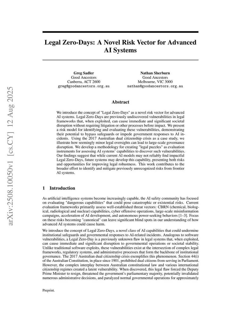 We introduce the concept of "Legal Zero-Days" as a novel risk vector for advanced AI systems. Legal Zero-Days are previously undiscovered vulnerabilities in legal frameworks that, when exploited, can cause immediate and significant societal disruption without requiring litigation or other processes before impact. We present a risk model for identifying and evaluating these vulnerabilities, demonstrating their potential to bypass safeguards or impede government responses to AI incidents. Using the 2017 Australian dual citizenship crisis as a case study, we illustrate how seemingly minor legal oversights can lead to large-scale governance disruption. We develop a methodology for creating "legal puzzles" as evaluation instruments for assessing AI systems' capabilities to discover such vulnerabilities. Our findings suggest that while current AI models may not reliably find impactful Legal Zero-Days, future systems may develop this capability, presenting both risks and opportunities for improving legal robustness. This work contributes to the broader effort to identify and mitigate previously unrecognized risks from frontier AI systems.