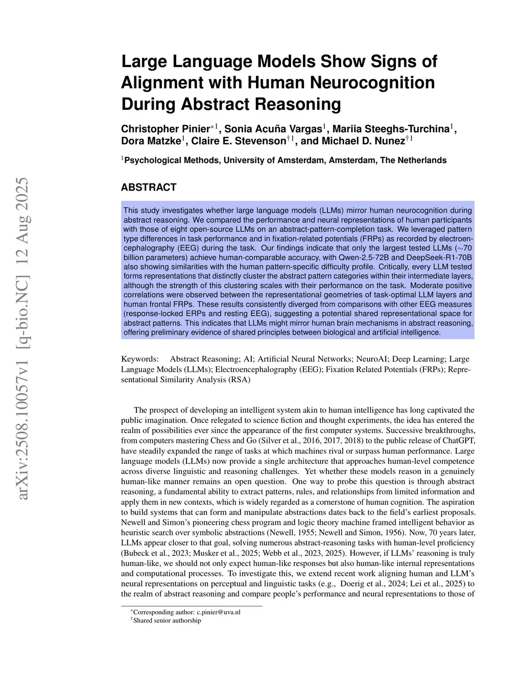 This study investigates whether large language models (LLMs) mirror human neurocognition during abstract reasoning. We compared the performance and neural representations of human participants with those of eight open-source LLMs on an abstract-pattern-completion task. We leveraged pattern type differences in task performance and in fixation-related potentials (FRPs) as recorded by electroencephalography (EEG) during the task. Our findings indicate that only the largest tested LLMs (~70 billion parameters) achieve human-comparable accuracy, with Qwen-2.5-72B and DeepSeek-R1-70B also showing similarities with the human pattern-specific difficulty profile. Critically, every LLM tested forms representations that distinctly cluster the abstract pattern categories within their intermediate layers, although the strength of this clustering scales with their performance on the task. Moderate positive correlations were observed between the representational geometries of task-optimal LLM layers and human frontal FRPs. These results consistently diverged from comparisons with other EEG measures (response-locked ERPs and resting EEG), suggesting a potential shared representational space for abstract patterns. This indicates that LLMs might mirror human brain mechanisms in abstract reasoning, offering preliminary evidence of shared principles between biological and artificial intelligence.