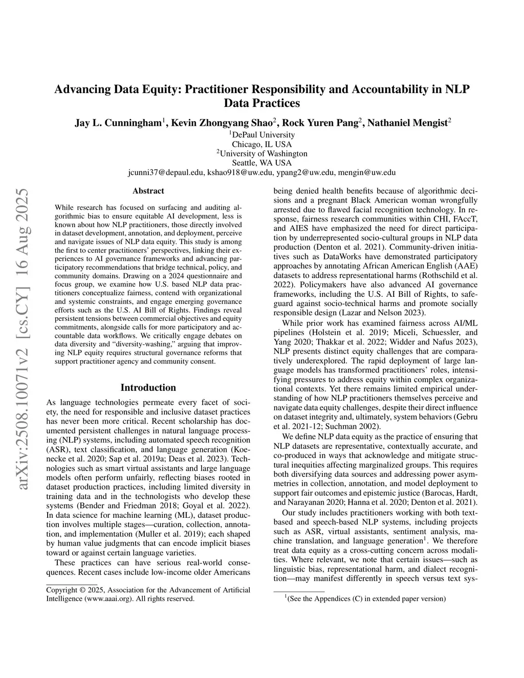 While research has focused on surfacing and auditing algorithmic bias to ensure equitable AI development, less is known about how NLP practitioners - those directly involved in dataset development, annotation, and deployment - perceive and navigate issues of NLP data equity. This study is among the first to center practitioners' perspectives, linking their experiences to a multi-scalar AI governance framework and advancing participatory recommendations that bridge technical, policy, and community domains. Drawing on a 2024 questionnaire and focus group, we examine how U.S.-based NLP data practitioners conceptualize fairness, contend with organizational and systemic constraints, and engage emerging governance efforts such as the U.S. AI Bill of Rights. Findings reveal persistent tensions between commercial objectives and equity commitments, alongside calls for more participatory and accountable data workflows. We critically engage debates on data diversity and diversity washing, arguing that improving NLP equity requires structural governance reforms that support practitioner agency and community consent.