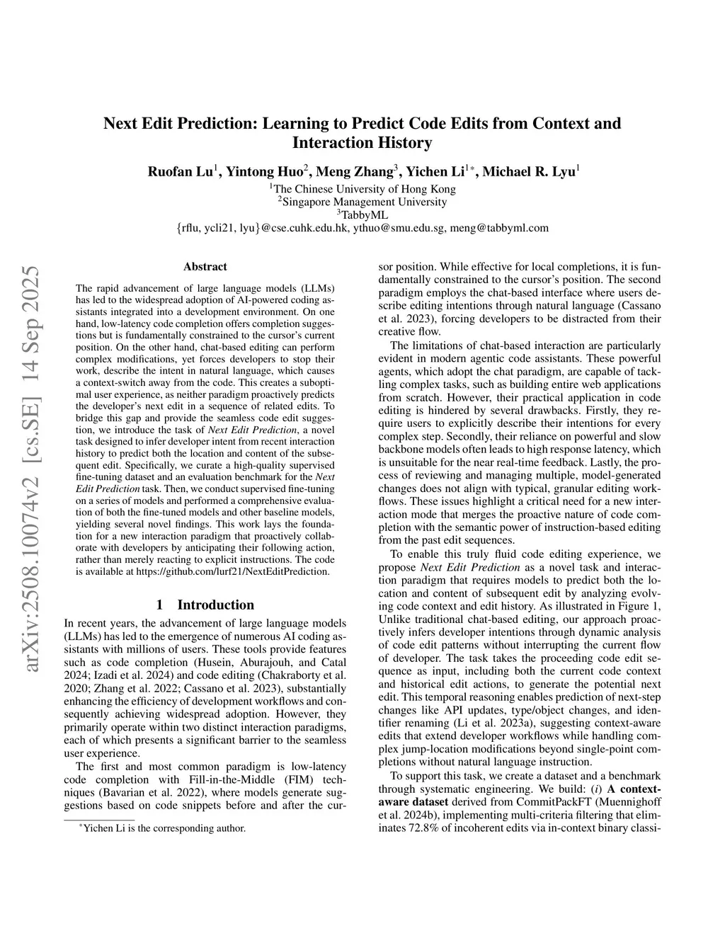 The rapid advancement of large language models (LLMs) has led to the widespread adoption of AI-powered coding assistants integrated into a development environment. On one hand, low-latency code completion offers completion suggestions but is fundamentally constrained to the cursor's current position. On the other hand, chat-based editing can perform complex modifications, yet forces developers to stop their work, describe the intent in natural language, which causes a context-switch away from the code. This creates a suboptimal user experience, as neither paradigm proactively predicts the developer's next edit in a sequence of related edits. To bridge this gap and provide the seamless code edit suggestion, we introduce the task of Next Edit Prediction, a novel task designed to infer developer intent from recent interaction history to predict both the location and content of the subsequent edit. Specifically, we curate a high-quality supervised fine-tuning dataset and an evaluation benchmark for the Next Edit Prediction task. Then, we conduct supervised fine-tuning on a series of models and performed a comprehensive evaluation of both the fine-tuned models and other baseline models, yielding several novel findings. This work lays the foundation for a new interaction paradigm that proactively collaborate with developers by anticipating their following action, rather than merely reacting to explicit instructions. The code is available atthis https URL.