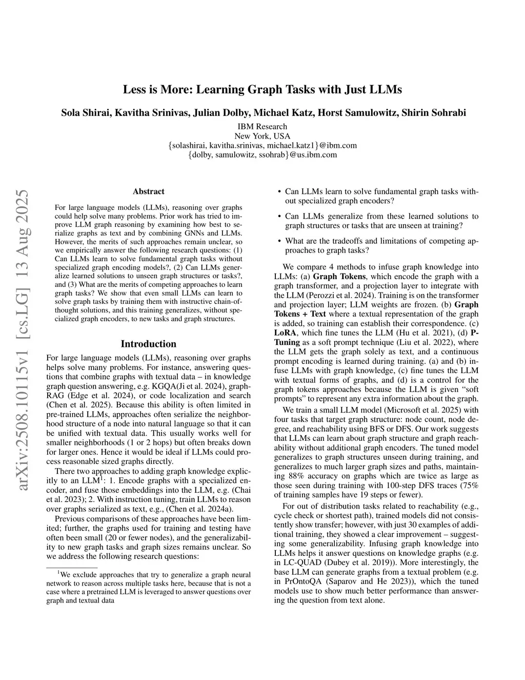 For large language models (LLMs), reasoning over graphs could help solve many problems. Prior work has tried to improve LLM graph reasoning by examining how best to serialize graphs as text and by combining GNNs and LLMs. However, the merits of such approaches remain unclear, so we empirically answer the following research questions: (1) Can LLMs learn to solve fundamental graph tasks without specialized graph encoding models?, (2) Can LLMs generalize learned solutions to unseen graph structures or tasks?, and (3) What are the merits of competing approaches to learn graph tasks? We show that even small LLMs can learn to solve graph tasks by training them with instructive chain-of-thought solutions, and this training generalizes, without specialized graph encoders, to new tasks and graph structures.