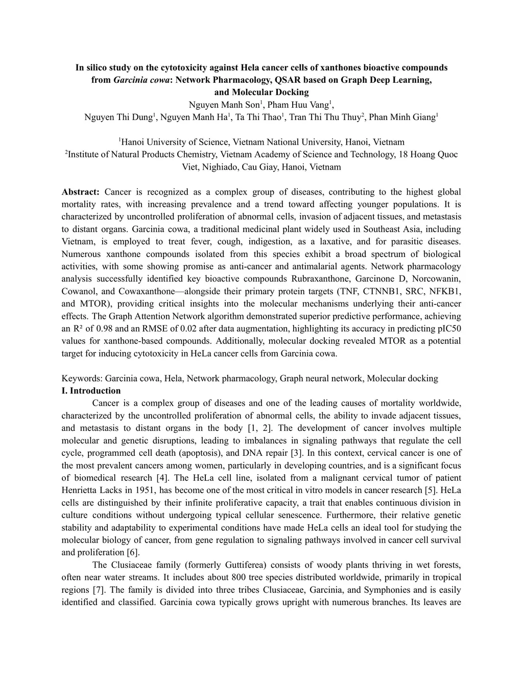 Cancer is recognized as a complex group of diseases, contributing to the highest global mortality rates, with increasing prevalence and a trend toward affecting younger populations. It is characterized by uncontrolled proliferation of abnormal cells, invasion of adjacent tissues, and metastasis to distant organs. Garcinia cowa, a traditional medicinal plant widely used in Southeast Asia, including Vietnam, is employed to treat fever, cough, indigestion, as a laxative, and for parasitic diseases. Numerous xanthone compounds isolated from this species exhibit a broad spectrum of biological activities, with some showing promise as anti cancer and antimalarial agents. Network pharmacology analysis successfully identified key bioactive compounds Rubraxanthone, Garcinone D, Norcowanin, Cowanol, and Cowaxanthone alongside their primary protein targets (TNF, CTNNB1, SRC, NFKB1, and MTOR), providing critical insights into the molecular mechanisms underlying their anti-cancer effects. The Graph Attention Network algorithm demonstrated superior predictive performance, achieving an R2 of 0.98 and an RMSE of 0.02 after data augmentation, highlighting its accuracy in predicting pIC50 values for xanthone based compounds. Additionally, molecular docking revealed MTOR as a potential target for inducing cytotoxicity in HeLa cancer cells from Garcinia cowa.