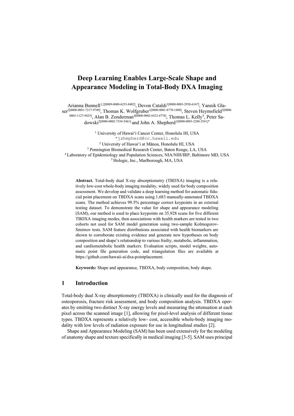 Total-body dual X-ray absorptiometry (TBDXA) imaging is a relatively low-cost whole-body imaging modality, widely used for body composition assessment. We develop and validate a deep learning method for automatic fiducial point placement on TBDXA scans using 1,683 manually-annotated TBDXA scans. The method achieves 99.5% percentage correct keypoints in an external testing dataset. To demonstrate the value for shape and appearance modeling (SAM), our method is used to place keypoints on 35,928 scans for five different TBDXA imaging modes, then associations with health markers are tested in two cohorts not used for SAM model generation using two-sample Kolmogorov-Smirnov tests. SAM feature distributions associated with health biomarkers are shown to corroborate existing evidence and generate new hypotheses on body composition and shape's relationship to various frailty, metabolic, inflammation, and cardiometabolic health markers. Evaluation scripts, model weights, automatic point file generation code, and triangulation files are available atthis https URL.