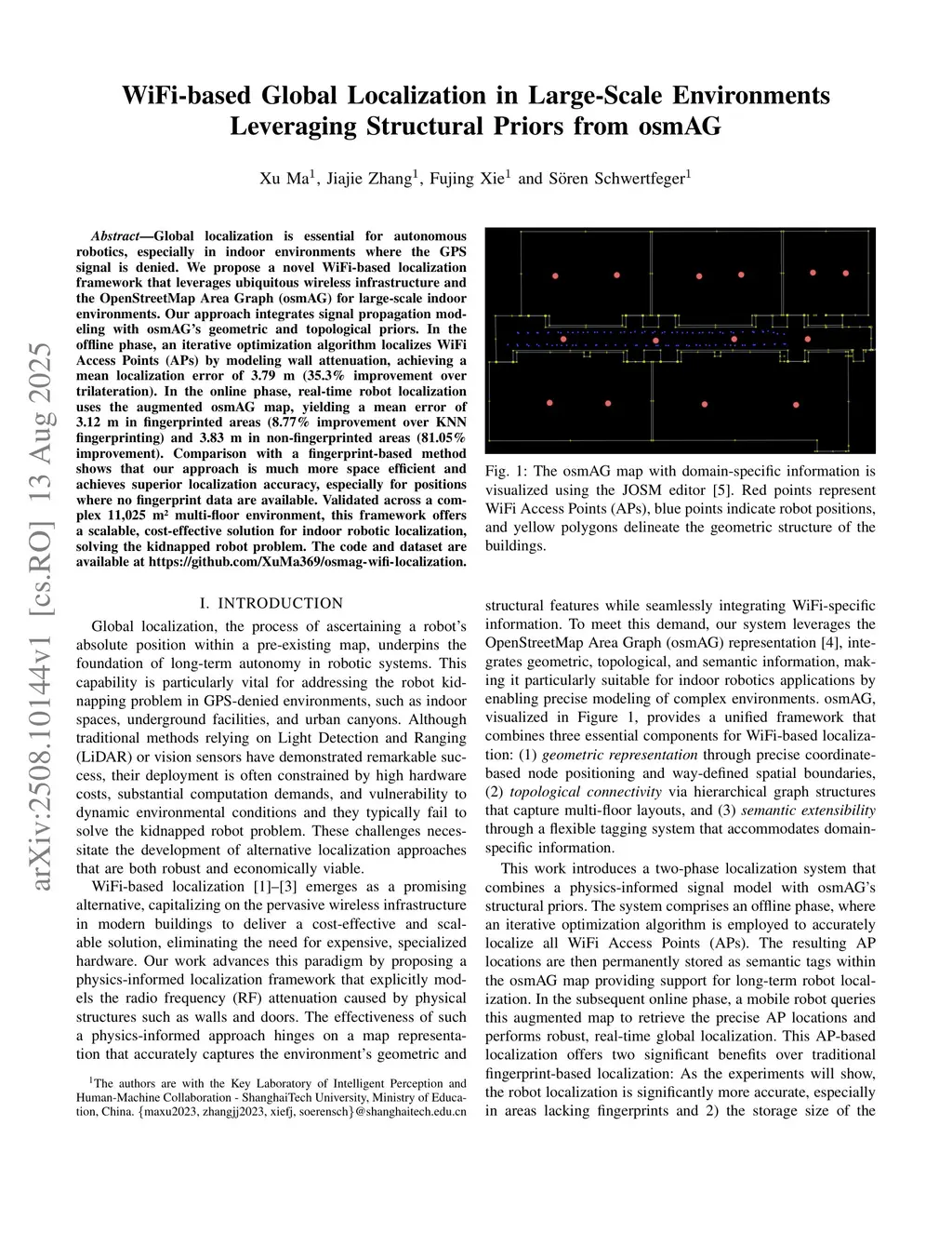 Global localization is essential for autonomous robotics, especially in indoor environments where the GPS signal is denied. We propose a novel WiFi-based localization framework that leverages ubiquitous wireless infrastructure and the OpenStreetMap Area Graph (osmAG) for large-scale indoor environments. Our approach integrates signal propagation modeling with osmAG's geometric and topological priors. In the offline phase, an iterative optimization algorithm localizes WiFi Access Points (APs) by modeling wall attenuation, achieving a mean localization error of 3.79 m (35.3\% improvement over trilateration). In the online phase, real-time robot localization uses the augmented osmAG map, yielding a mean error of 3.12 m in fingerprinted areas (8.77\% improvement over KNN fingerprinting) and 3.83 m in non-fingerprinted areas (81.05\% improvement). Comparison with a fingerprint-based method shows that our approach is much more space efficient and achieves superior localization accuracy, especially for positions where no fingerprint data are available. Validated across a complex 11,025 &m^2& multi-floor environment, this framework offers a scalable, cost-effective solution for indoor robotic localization, solving the kidnapped robot problem. The code and dataset are available atthis https URL.