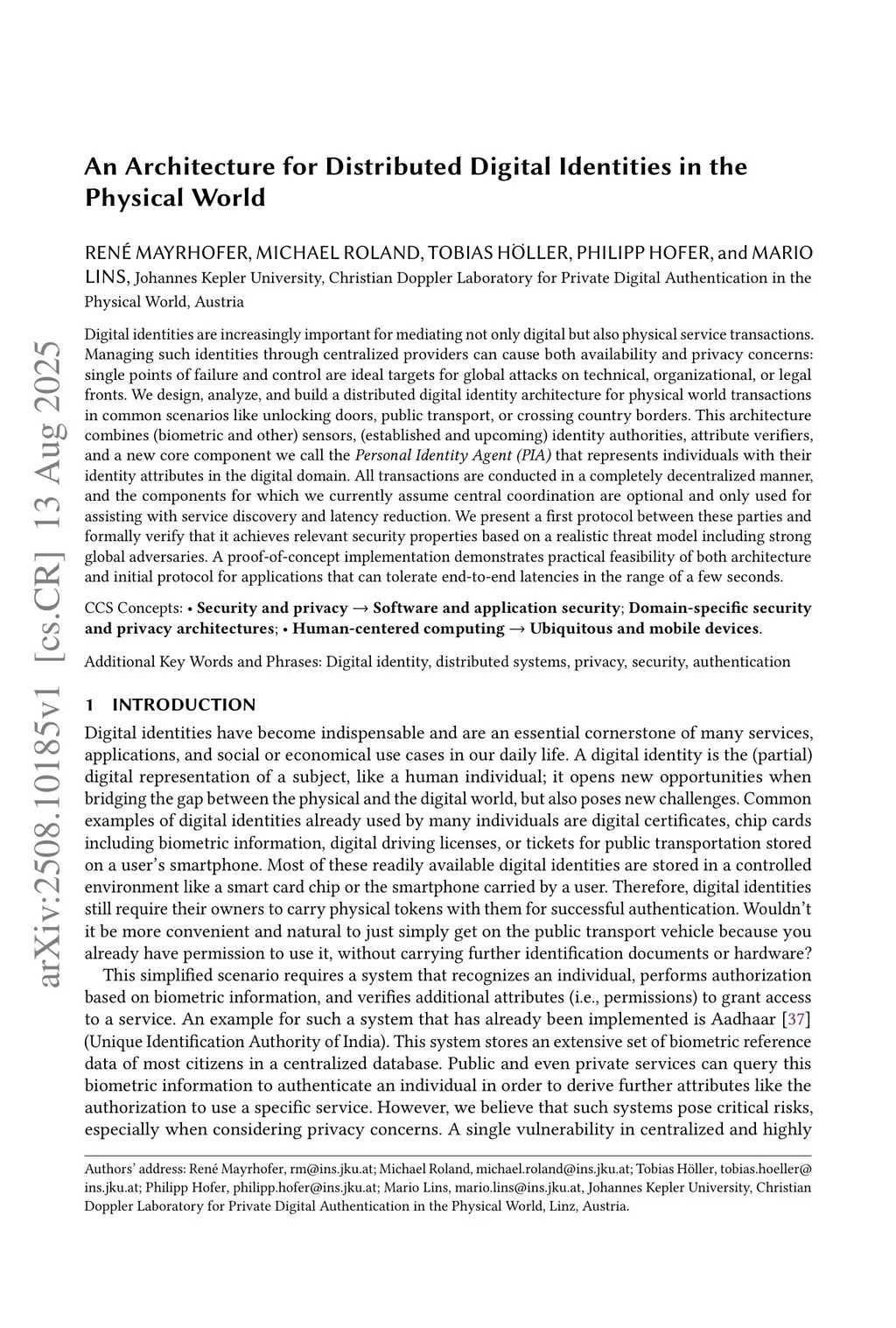 Digital identities are increasingly important for mediating not only digital but also physical service transactions. Managing such identities through centralized providers can cause both availability and privacy concerns: single points of failure and control are ideal targets for global attacks on technical, organizational, or legal fronts. We design, analyze, and build a distributed digital identity architecture for physical world transactions in common scenarios like unlocking doors, public transport, or crossing country borders. This architecture combines (biometric and other) sensors, (established and upcoming) identity authorities, attribute verifiers, and a new core component we call the \emph{Personal Identity Agent (PIA)} that represents individuals with their identity attributes in the digital domain. All transactions are conducted in a completely decentralized manner, and the components for which we currently assume central coordination are optional and only used for assisting with service discovery and latency reduction. We present a first protocol between these parties and formally verify that it achieves relevant security properties based on a realistic threat model including strong global adversaries. A proof-of-concept implementation demonstrates practical feasibility of both architecture and initial protocol for applications that can tolerate end-to-end latencies in the range of a few seconds.