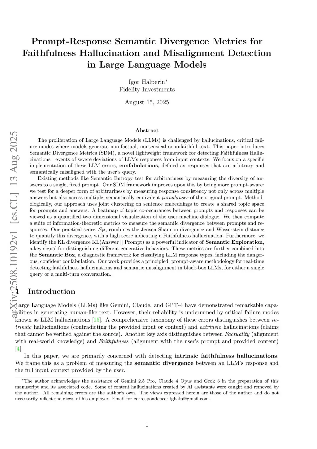 Prompt-Response Semantic Divergence Metrics for Faithfulness Hallucination and Misalignment Detection in Large Language Models