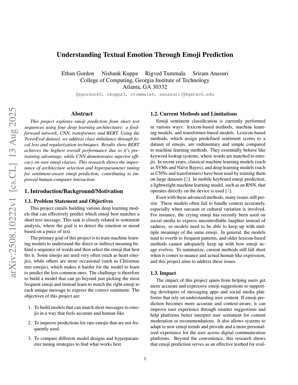 This project explores emoji prediction from short text sequences using four deep learning architectures: a feed-forward network, CNN, transformer, and BERT. Using the TweetEval dataset, we address class imbalance through focal loss and regularization techniques. Results show BERT achieves the highest overall performance due to its pre-training advantage, while CNN demonstrates superior efficacy on rare emoji classes. This research shows the importance of architecture selection and hyperparameter tuning for sentiment-aware emoji prediction, contributing to improved human-computer interaction.