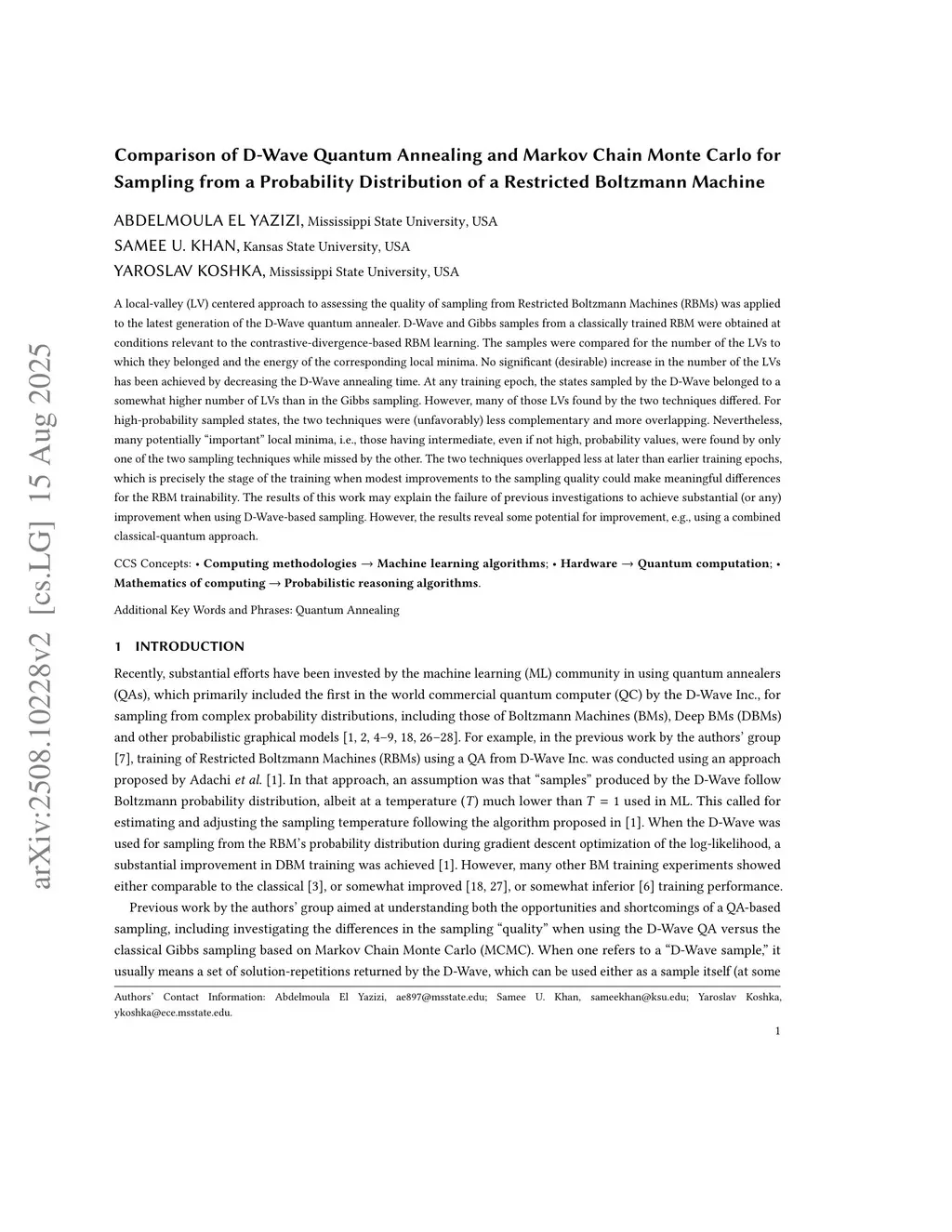 A local-valley (LV) centered approach to assessing the quality of sampling from Restricted Boltzmann Machines (RBMs) was applied to the latest generation of the D-Wave quantum annealer. D-Wave and Gibbs samples from a classically trained RBM were obtained at conditions relevant to the contrastive-divergence-based RBM learning. The samples were compared for the number of the LVs to which they belonged and the energy of the corresponding local minima. No significant (desirable) increase in the number of the LVs has been achieved by decreasing the D-Wave annealing time. At any training epoch, the states sampled by the D-Wave belonged to a somewhat higher number of LVs than in the Gibbs sampling. However, many of those LVs found by the two techniques differed. For high-probability sampled states, the two techniques were (unfavorably) less complementary and more overlapping. Nevertheless, many potentially "important" local minima, i.e., those having intermediate, even if not high, probability values, were found by only one of the two sampling techniques while missed by the other. The two techniques overlapped less at later than earlier training epochs, which is precisely the stage of the training when modest improvements to the sampling quality could make meaningful differences for the RBM trainability. The results of this work may explain the failure of previous investigations to achieve substantial (or any) improvement when using D-Wave-based sampling. However, the results reveal some potential for improvement, e.g., using a combined classical-quantum approach.
