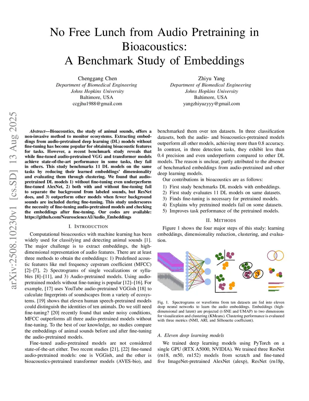 Bioacoustics, the study of animal sounds, offers a non-invasive method to monitor ecosystems. Extracting embeddings from audio-pretrained deep learning (DL) models without fine-tuning has become popular for obtaining bioacoustic features for tasks. However, a recent benchmark study reveals that while fine-tuned audio-pretrained VGG and transformer models achieve state-of-the-art performance in some tasks, they fail in others. This study benchmarks 11 DL models on the same tasks by reducing their learned embeddings' dimensionality and evaluating them through clustering. We found that audio-pretrained DL models 1) without fine-tuning even underperform fine-tuned AlexNet, 2) both with and without fine-tuning fail to separate the background from labeled sounds, but ResNet does, and 3) outperform other models when fewer background sounds are included during fine-tuning. This study underscores the necessity of fine-tuning audio-pretrained models and checking the embeddings after fine-tuning. Our codes are available:this https URL\_Embeddings