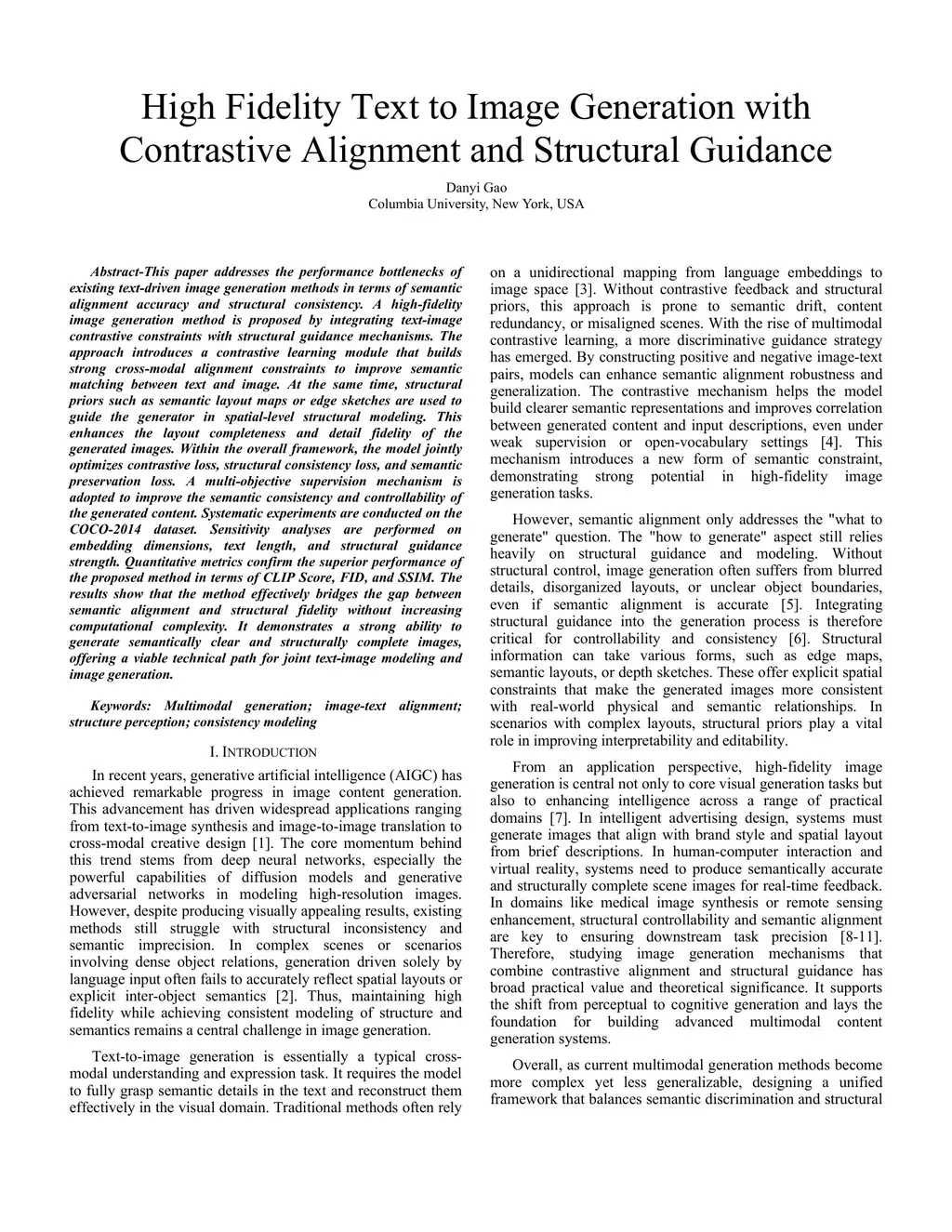 This paper addresses the performance bottlenecks of existing text-driven image generation methods in terms of semantic alignment accuracy and structural consistency. A high-fidelity image generation method is proposed by integrating text-image contrastive constraints with structural guidance mechanisms. The approach introduces a contrastive learning module that builds strong cross-modal alignment constraints to improve semantic matching between text and image. At the same time, structural priors such as semantic layout maps or edge sketches are used to guide the generator in spatial-level structural modeling. This enhances the layout completeness and detail fidelity of the generated images. Within the overall framework, the model jointly optimizes contrastive loss, structural consistency loss, and semantic preservation loss. A multi-objective supervision mechanism is adopted to improve the semantic consistency and controllability of the generated content. Systematic experiments are conducted on the COCO-2014 dataset. Sensitivity analyses are performed on embedding dimensions, text length, and structural guidance strength. Quantitative metrics confirm the superior performance of the proposed method in terms of CLIP Score, FID, and SSIM. The results show that the method effectively bridges the gap between semantic alignment and structural fidelity without increasing computational complexity. It demonstrates a strong ability to generate semantically clear and structurally complete images, offering a viable technical path for joint text-image modeling and image generation.