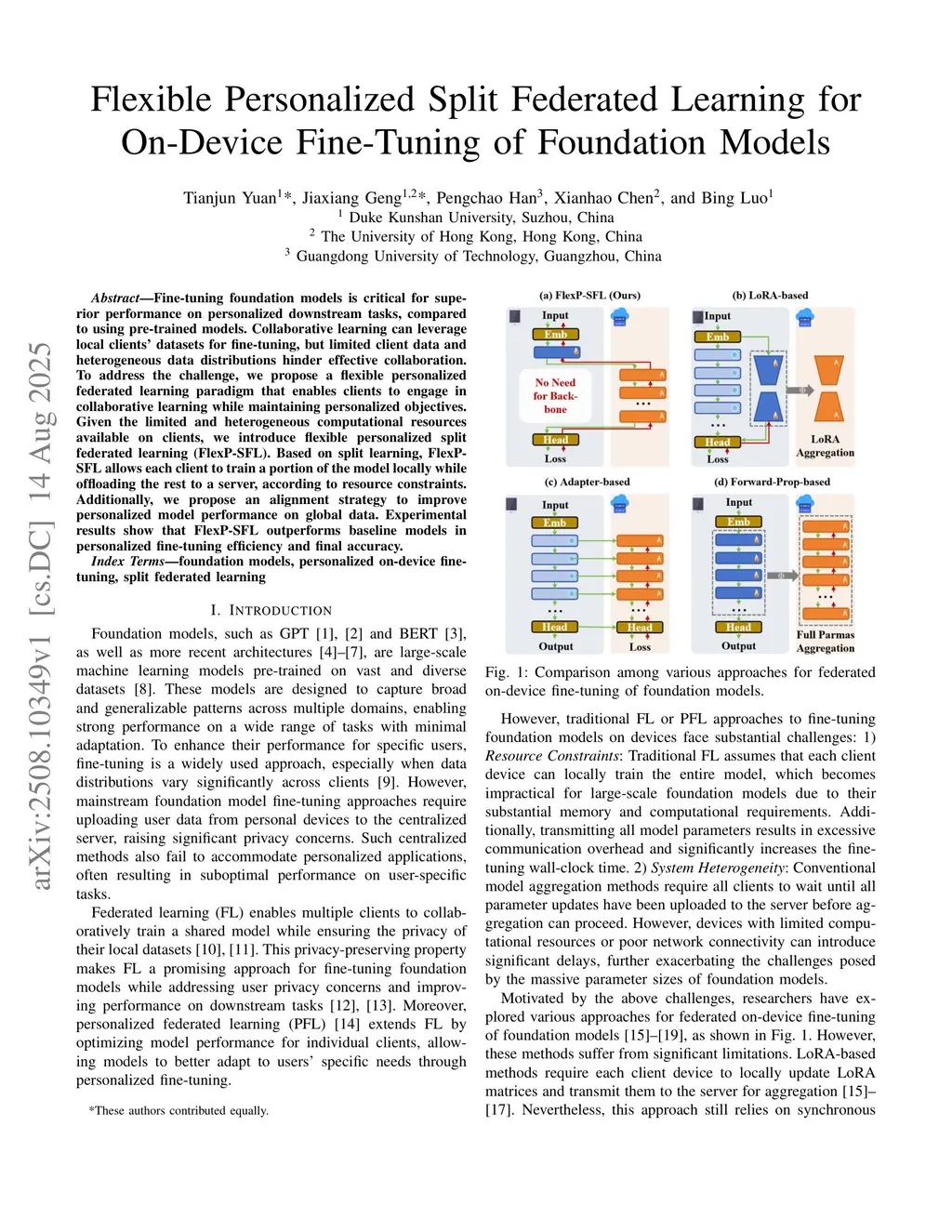 Fine-tuning foundation models is critical for superior performance on personalized downstream tasks, compared to using pre-trained models. Collaborative learning can leverage local clients' datasets for fine-tuning, but limited client data and heterogeneous data distributions hinder effective collaboration. To address the challenge, we propose a flexible personalized federated learning paradigm that enables clients to engage in collaborative learning while maintaining personalized objectives. Given the limited and heterogeneous computational resources available on clients, we introduce \textbf{flexible personalized split federated learning (FlexP-SFL)}. Based on split learning, FlexP-SFL allows each client to train a portion of the model locally while offloading the rest to a server, according to resource constraints. Additionally, we propose an alignment strategy to improve personalized model performance on global data. Experimental results show that FlexP-SFL outperforms baseline models in personalized fine-tuning efficiency and final accuracy.