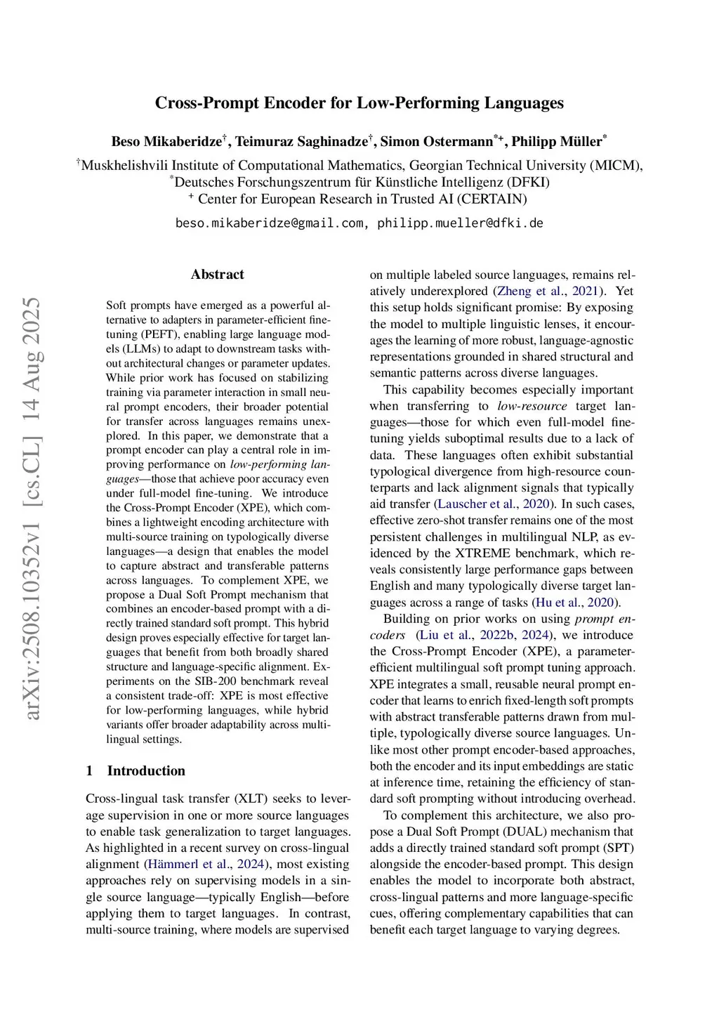 Soft prompts have emerged as a powerful alternative to adapters in parameter-efficient fine-tuning (PEFT), enabling large language models (LLMs) to adapt to downstream tasks without architectural changes or parameter updates. While prior work has focused on stabilizing training via parameter interaction in small neural prompt encoders, their broader potential for transfer across languages remains unexplored. In this paper, we demonstrate that a prompt encoder can play a central role in improving performance on low-performing languages - those that achieve poor accuracy even under full-model fine-tuning. We investigate a lightweight encoder paired with multi-source training on typologically diverse languages. We call this architecture-training combination the Cross-Prompt Encoder (XPE), and show that it advances the capture of abstract, transferable patterns across languages. To complement XPE, we propose a Dual Soft Prompt mechanism that combines an encoder-based prompt with a directly trained standard soft prompt. This hybrid design proves especially effective for target languages that benefit from both broadly shared structure and language-specific alignment. Text classification experiments with a transformer encoder (XLM-R) on the SIB-200 benchmark reveal a consistent trade-off: XPE is most effective for low-performing languages, while hybrid variants offer broader adaptability across multilingual settings.