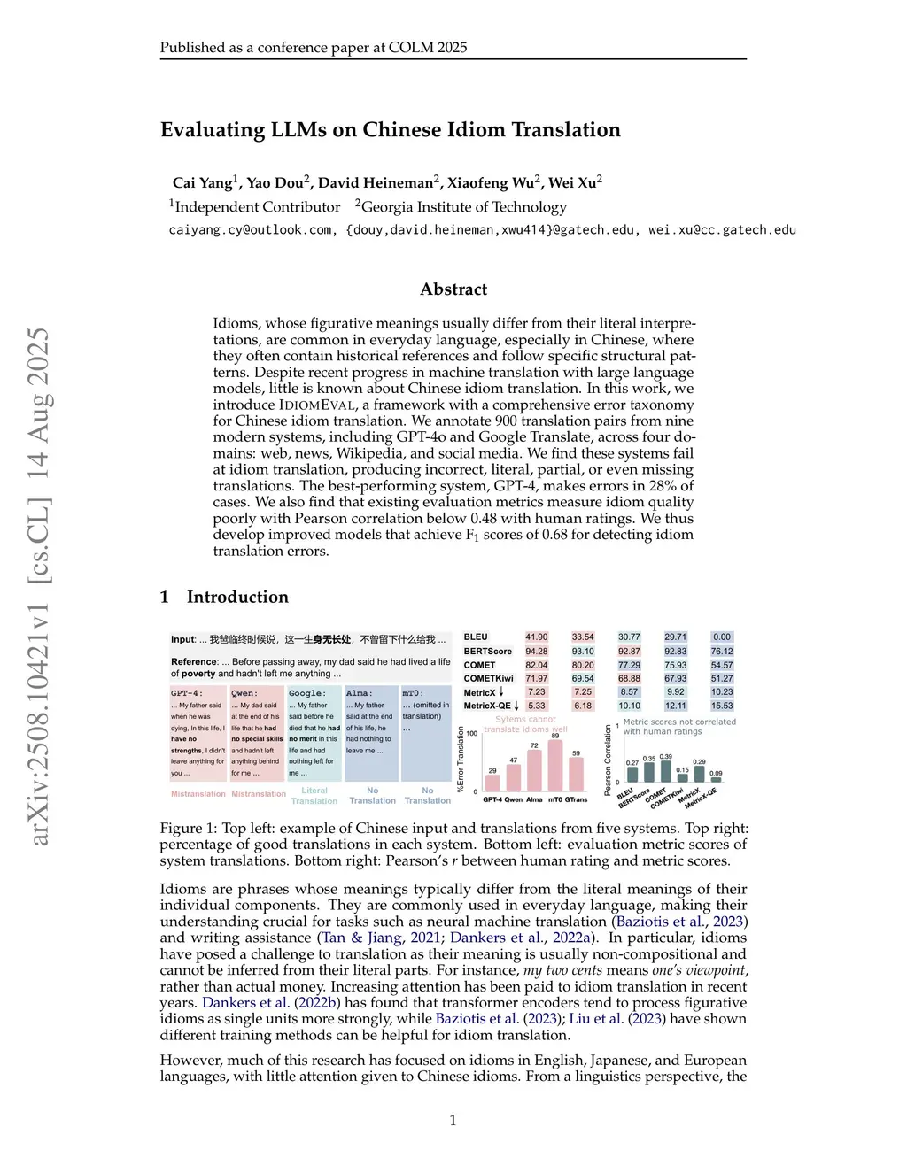 Idioms, whose figurative meanings usually differ from their literal interpretations, are common in everyday language, especially in Chinese, where they often contain historical references and follow specific structural patterns. Despite recent progress in machine translation with large language models, little is known about Chinese idiom translation. In this work, we introduce IdiomEval, a framework with a comprehensive error taxonomy for Chinese idiom translation. We annotate 900 translation pairs from nine modern systems, including GPT-4o and Google Translate, across four domains: web, news, Wikipedia, and social media. We find these systems fail at idiom translation, producing incorrect, literal, partial, or even missing translations. The best-performing system, GPT-4, makes errors in 28% of cases. We also find that existing evaluation metrics measure idiom quality poorly with Pearson correlation below 0.48 with human ratings. We thus develop improved models that achieve F scores of 0.68 for detecting idiom translation errors.