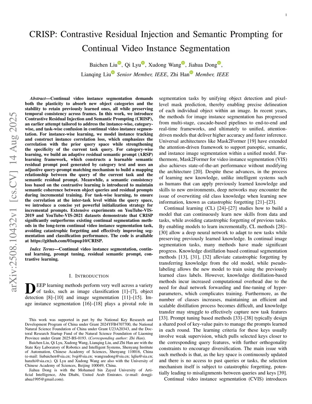 Continual video instance segmentation demands both the plasticity to absorb new object categories and the stability to retain previously learned ones, all while preserving temporal consistency across frames. In this work, we introduce Contrastive Residual Injection and Semantic Prompting (CRISP), an earlier attempt tailored to address the instance-wise, category-wise, and task-wise confusion in continual video instance segmentation. For instance-wise learning, we model instance tracking and construct instance correlation loss, which emphasizes the correlation with the prior query space while strengthening the specificity of the current task query. For category-wise learning, we build an adaptive residual semantic prompt (ARSP) learning framework, which constructs a learnable semantic residual prompt pool generated by category text and uses an adjustive query-prompt matching mechanism to build a mapping relationship between the query of the current task and the semantic residual prompt. Meanwhile, a semantic consistency loss based on the contrastive learning is introduced to maintain semantic coherence between object queries and residual prompts during incremental training. For task-wise learning, to ensure the correlation at the inter-task level within the query space, we introduce a concise yet powerful initialization strategy for incremental prompts. Extensive experiments on YouTube-VIS-2019 and YouTube-VIS-2021 datasets demonstrate that CRISP significantly outperforms existing continual segmentation methods in the long-term continual video instance segmentation task, avoiding catastrophic forgetting and effectively improving segmentation and classification performance. The code is available atthis https URL.