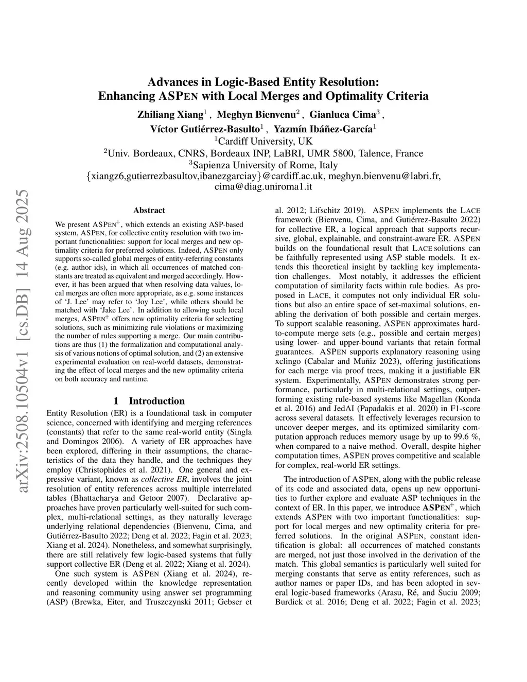 Advances in Logic-Based Entity Resolution: Enhancing ASPEN with Local Merges and Optimality Criteria