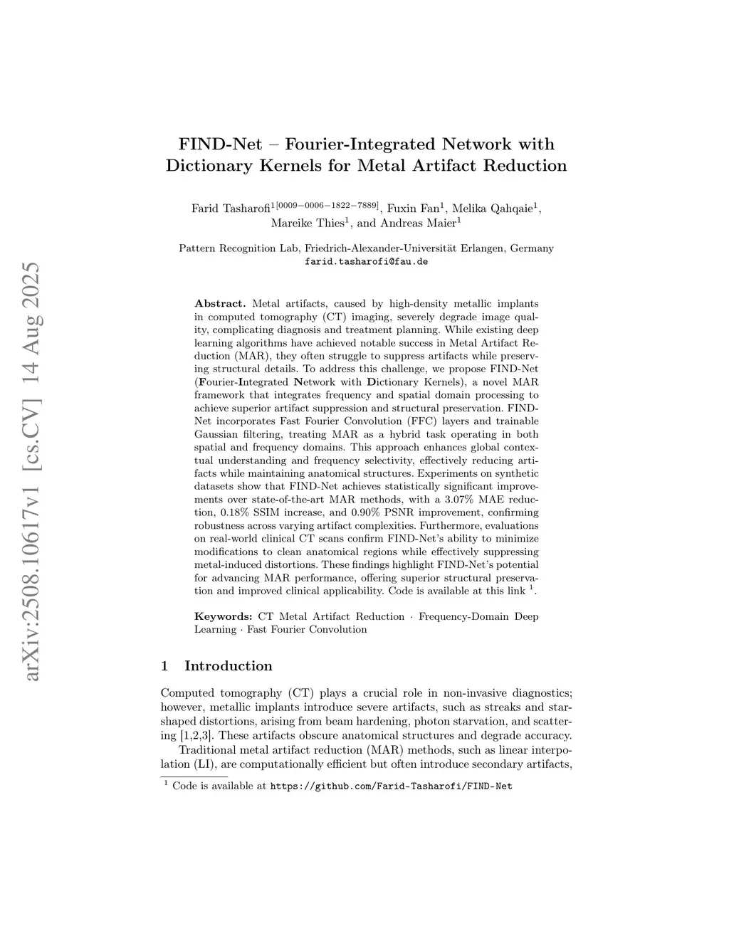 FIND-Net -- Fourier-Integrated Network with Dictionary Kernels for Metal Artifact Reduction
