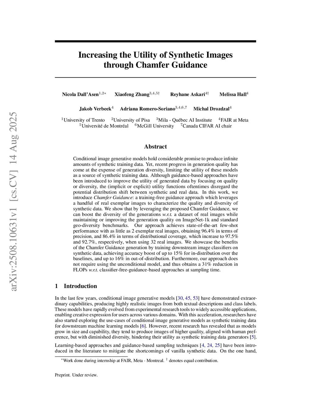 Conditional image generative models hold considerable promise to produce infinite amounts of synthetic training data. Yet, recent progress in generation quality has come at the expense of generation diversity, limiting the utility of these models as a source of synthetic training data. Although guidance-based approaches have been introduced to improve the utility of generated data by focusing on quality or diversity, the (implicit or explicit) utility functions oftentimes disregard the potential distribution shift between synthetic and real data. In this work, we introduce Chamfer Guidance: a training-free guidance approach which leverages a handful of real exemplar images to characterize the quality and diversity of synthetic data. We show that by leveraging the proposed Chamfer Guidance, we can boost the diversity of the generations w.r.t. a dataset of real images while maintaining or improving the generation quality on ImageNet-1k and standard geo-diversity benchmarks. Our approach achieves state-of-the-art few-shot performance with as little as 2 exemplar real images, obtaining 96.4% in terms of precision, and 86.4% in terms of distributional coverage, which increase to 97.5% and 92.7%, respectively, when using 32 real images. We showcase the benefits of the Chamfer Guidance generation by training downstream image classifiers on synthetic data, achieving accuracy boost of up to 15% for in-distribution over the baselines, and up to 16% in out-of-distribution. Furthermore, our approach does not require using the unconditional model, and thus obtains a 31% reduction in FLOPs w.r.t. classifier-free-guidance-based approaches at sampling time.