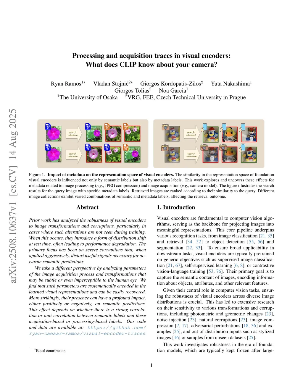Processing and acquisition traces in visual encoders: What does CLIP know about your camera?