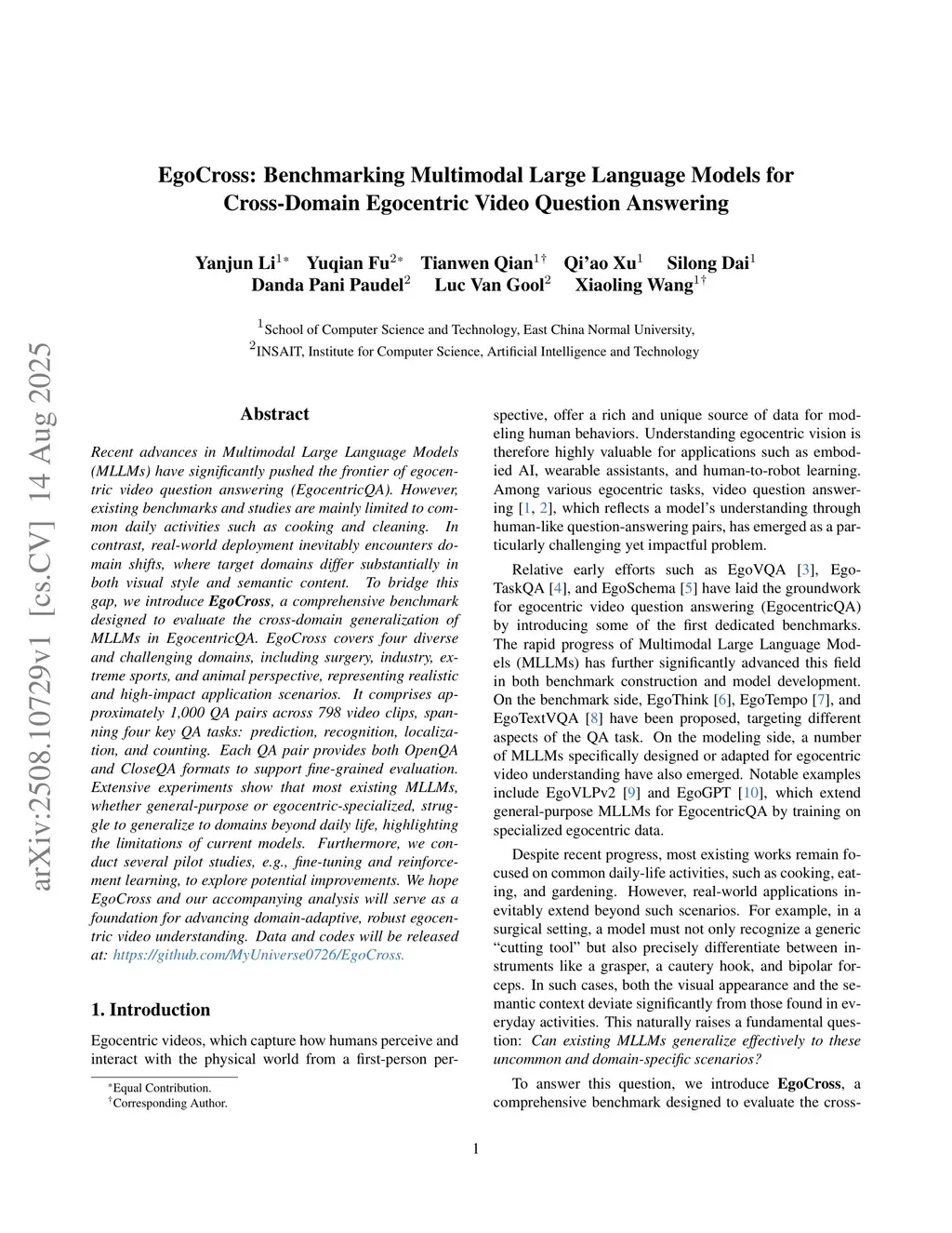 EgoCross: Benchmarking Multimodal Large Language Models for Cross-Domain Egocentric Video Question Answering