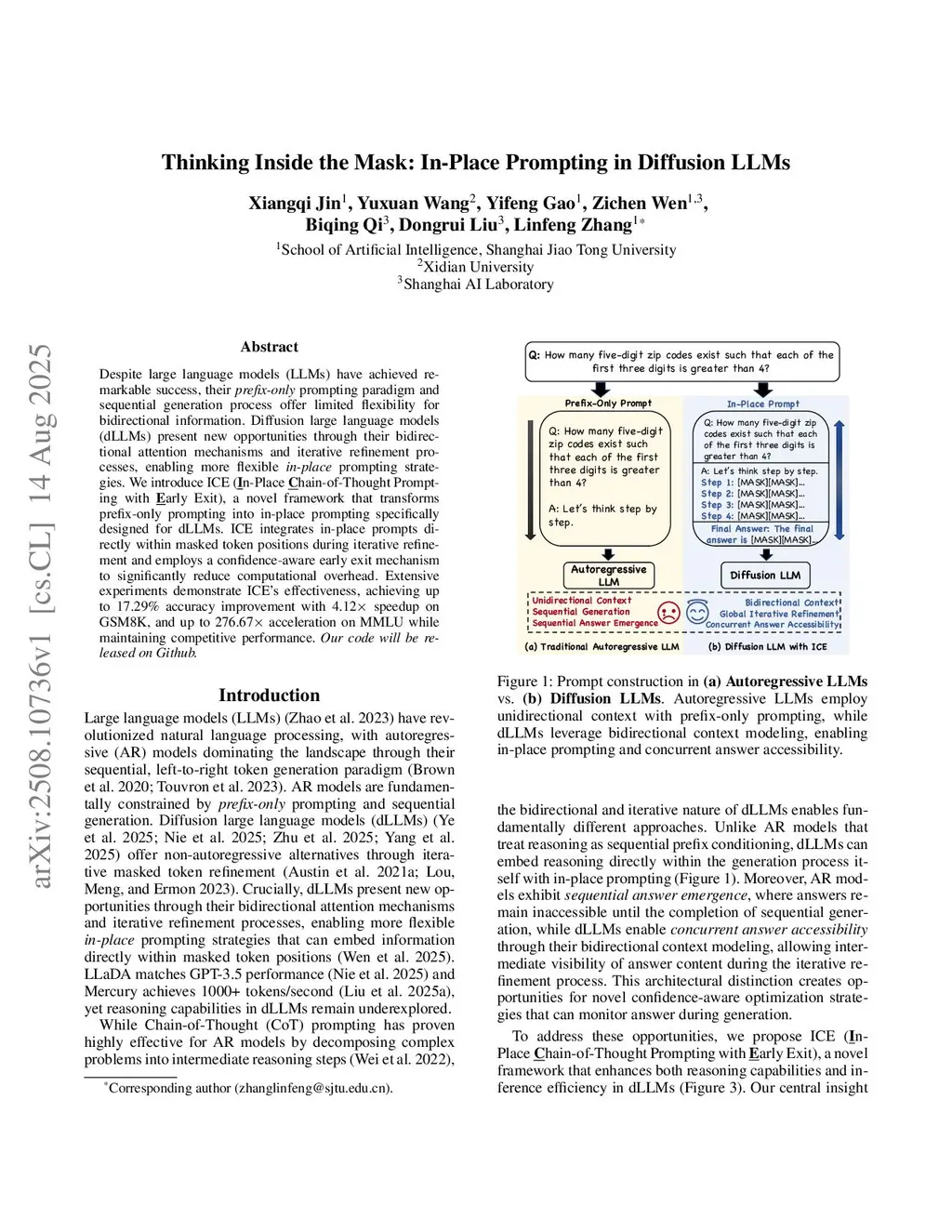Despite large language models (LLMs) have achieved remarkable success, their prefix-only prompting paradigm and sequential generation process offer limited flexibility for bidirectional information. Diffusion large language models (dLLMs) present new opportunities through their bidirectional attention mechanisms and iterative refinement processes, enabling more flexible in-place prompting strategies. We introduce ICE (In-Place Chain-of-Thought Prompting with Early Exit), a novel framework that transforms prefix-only prompting into in-place prompting specifically designed for dLLMs. ICE integrates in-place prompts directly within masked token positions during iterative refinement and employs a confidence-aware early exit mechanism to significantly reduce computational overhead. Extensive experiments demonstrate ICE's effectiveness, achieving up to 17.29% accuracy improvement with 4.12 speedup on GSM8K, and up to 276.67 acceleration on MMLU while maintaining competitive performance.